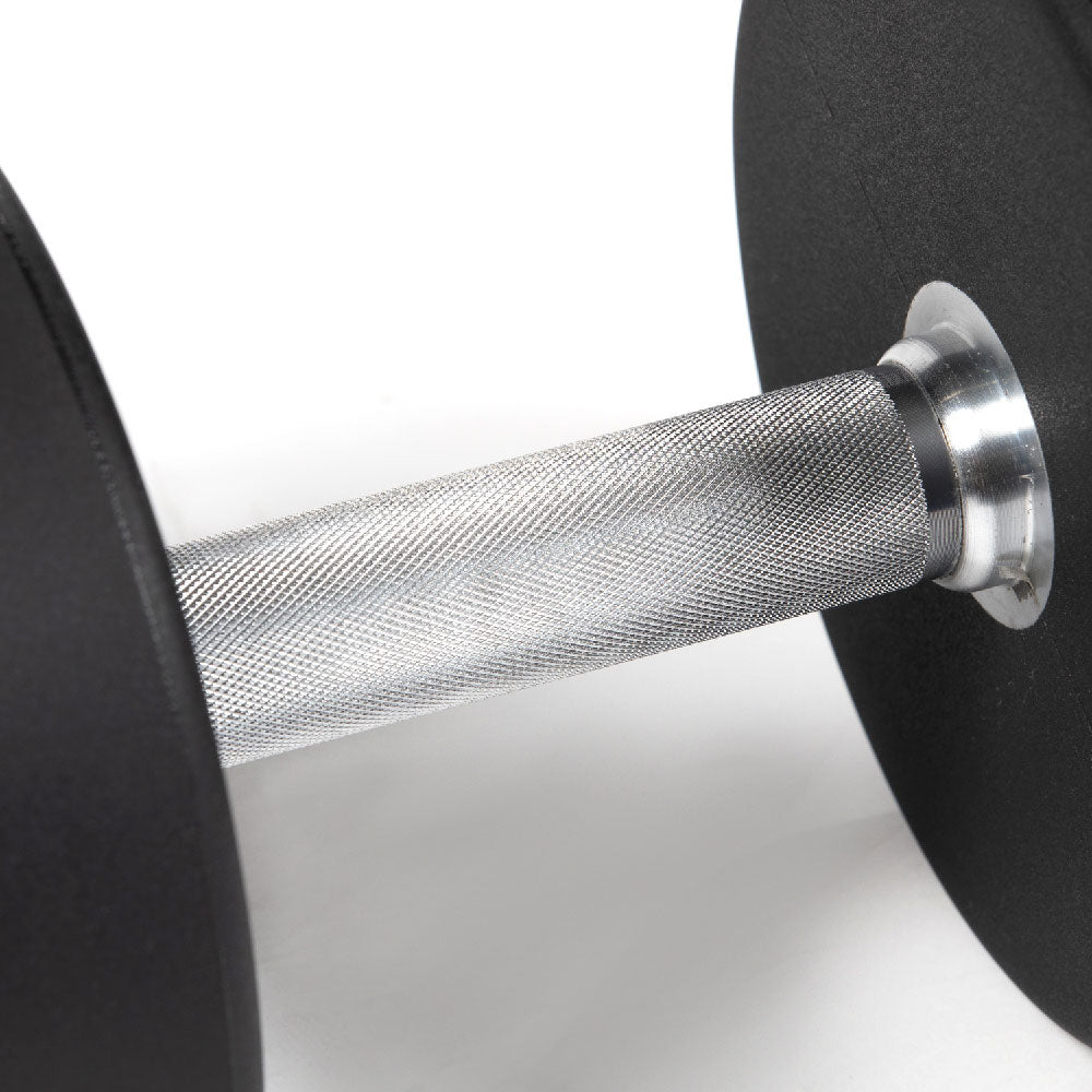 Perfect for powering through a range of exercises like curls, rows, and kickbacks, these 105 LB round dumbbells are ideal for dynamic movements like rollouts and renegade rows. With a rugged black urethane coating that outlasts traditional rubber dumbbells, they're odorless and tough enough to withstand heavy drops, keeping their shape and appearance intact for longer. 33mm hard chrome handles and medium volcano knurling ensure a rock-solid grip through every lift while bold, easy-to-read weight indicators make quick identification simple during intense workouts.