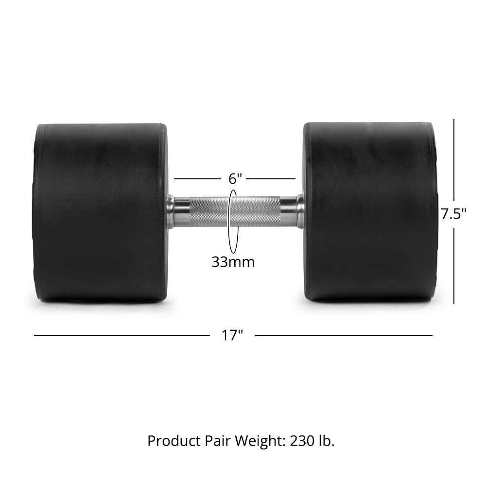 Perfect for powering through a range of exercises like curls, rows, and kickbacks, these 115 LB round dumbbells are ideal for dynamic movements like rollouts and renegade rows. With a rugged black urethane coating that outlasts traditional rubber dumbbells, they're odorless and tough enough to withstand heavy drops, keeping their shape and appearance intact for longer. 33mm hard chrome handles and medium volcano knurling ensure a rock-solid grip through every lift while bold, easy-to-read weight indicators make quick identification simple during intense workouts.