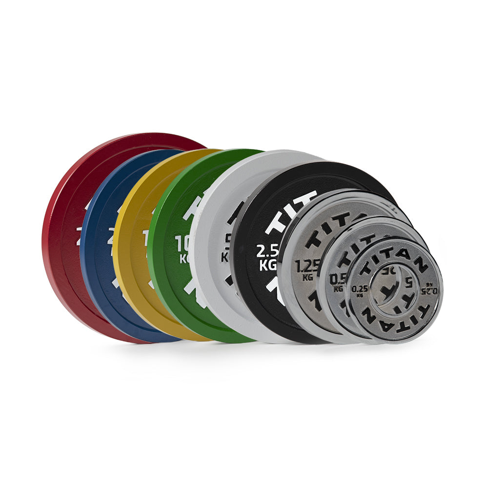 The Calibrated KG Steel Plates are designed and machined to have the thinnest profile available for minimal space usage on the bar. Each plate is color-coded for easy identification and features dual TITAN logos, KG weight indications, and a 50.5 mm collar opening, which fits Olympic-sized barbells. The back of each plate includes calibration plugs for greater precision within a 10-gram tolerance of weight. Suitable for Olympic weightlifting and Powerlifting, these precision discs are developed for but are not limited to squat, bench, and deadlift movements. Smash your daily workouts and hit your PR with these machine-calibrated plates.