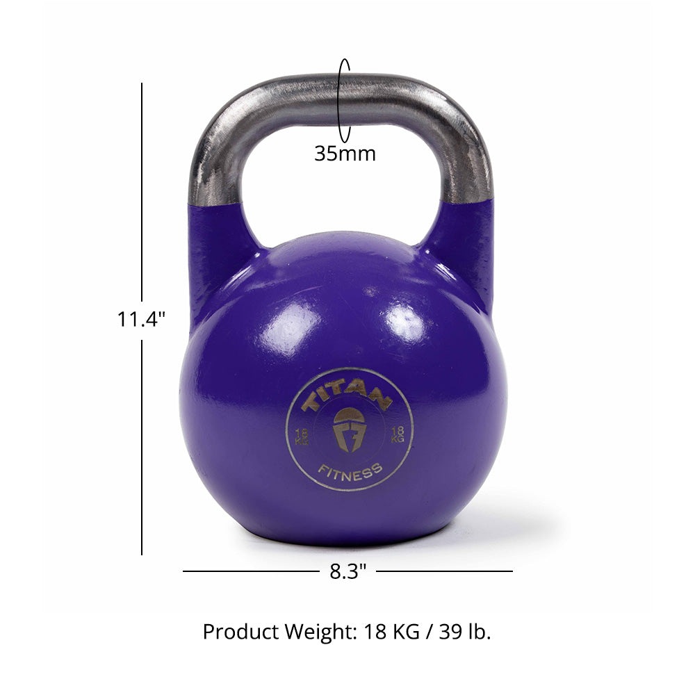 Competition Kettlebells are perfect for boosting strength, burning calories, and taking your workouts to the next level. They come in sizes ranging from 8 KG (18 LB) to 32 KG (70.5 LB) and are designed with a hollow core steel construction that keeps each kettlebell the same size, so you can focus on form as you progress. Each kettlebell in the set has consistent dimensions - 8.3" in diameter, 11.4" tall, and a 35mm handle width - making it easy to move up in weight without adjusting your grip or technique.