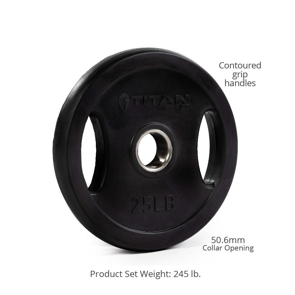 The Grip Plates are offered in pairs of 2.5 LB, 5 LB, 10 LB, and 25 LB increments and are sold individually in 35 LB, 45 LB, and 55- LB. Additionally, we offer a full set of 245 LB. Each plate is made from Cast Iron and provides a durable rubber coating that prevents the weight from chipping and rusting. Each plate is designed with a 50.6mm center hole and features contoured grip handles to provide a secure grip when carrying or loading them onto your Olympic size barbell.