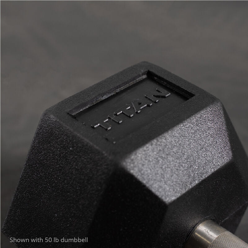 Unleash your inner Titan with the Rubber Coated Hex Dumbbells with stainless steel straight handles. These sturdy weights are premium quality equipment ideal for home and garage gyms. The straight, easy-to-grip handles are crafted from stainless steel and have a knurled texture for a comfortable and firm grip. They are offered in pairs ranging from 5 LB to 120 LB, featuring a 5" straight handle with a 28mm to 32mm diameter. The cast iron hexagonal heads encased in durable black rubber feature embossed weight increments and the TITAN logo on two sides for easy identification. These branded dumbbells are a great addition to any gym, whether you are just starting or a seasoned lifter.