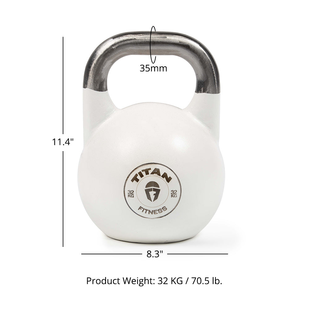 Competition Kettlebells are perfect for boosting strength, burning calories, and taking your workouts to the next level. They come in sizes ranging from 8 KG (18 LB) to 32 KG (70.5 LB) and are designed with a hollow core steel construction that keeps each kettlebell the same size, so you can focus on form as you progress. Each kettlebell in the set has consistent dimensions - 8.3" in diameter, 11.4" tall, and a 35mm handle width - making it easy to move up in weight without adjusting your grip or technique.