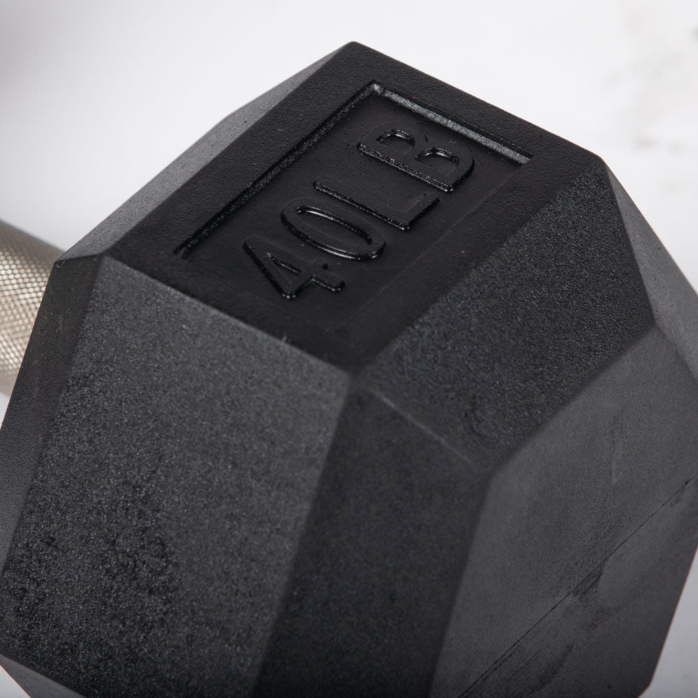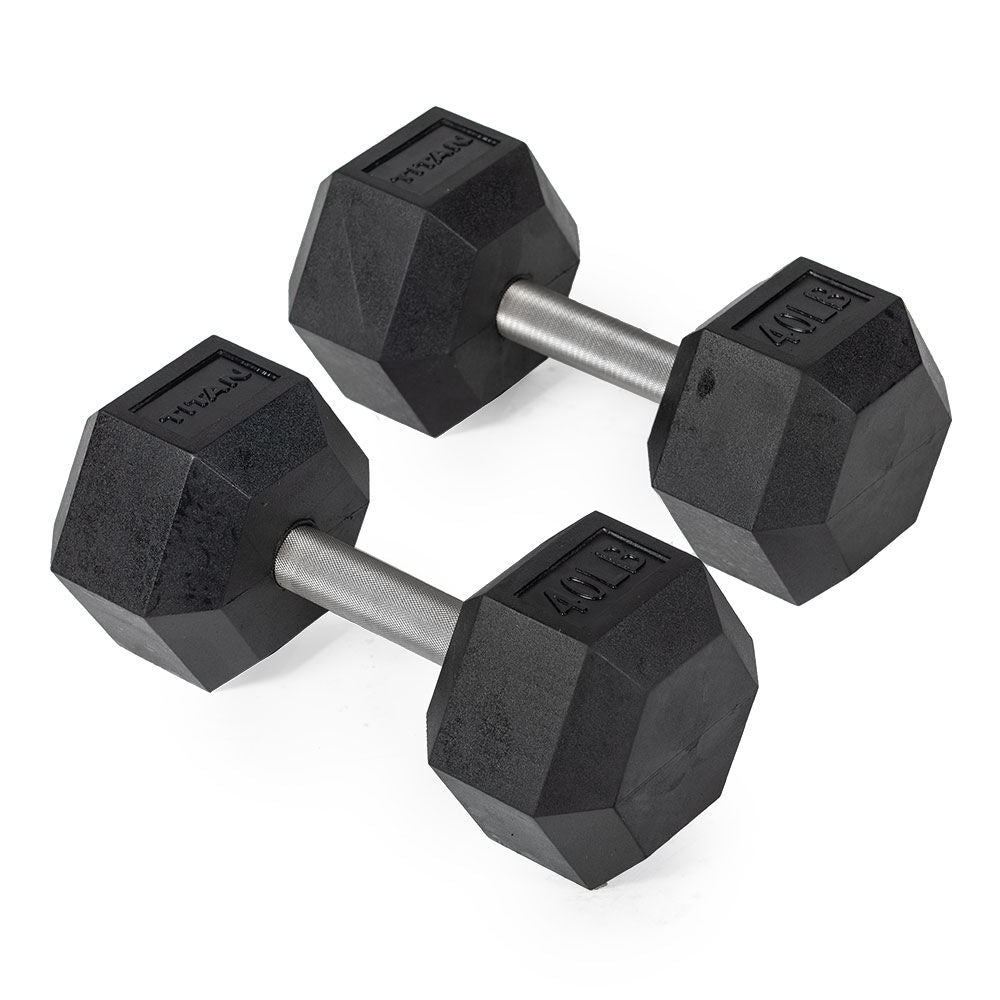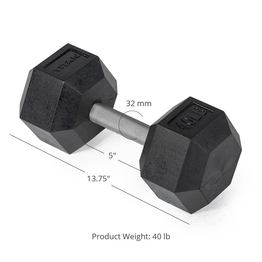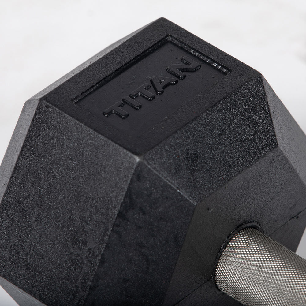 Unleash your inner Titan with the Rubber Coated Hex Dumbbells with stainless steel straight handles. These sturdy weights are premium quality equipment ideal for home and garage gyms. The straight, easy-to-grip handles are crafted from stainless steel and have a knurled texture for a comfortable and firm grip. They are offered in pairs ranging from 5 LB to 120 LB, featuring a 5" straight handle with a 28mm to 32mm diameter. The cast iron hexagonal heads encased in durable black rubber feature embossed weight increments and the TITAN logo on two sides for easy identification. These branded dumbbells are a great addition to any gym, whether you are just starting or a seasoned lifter.