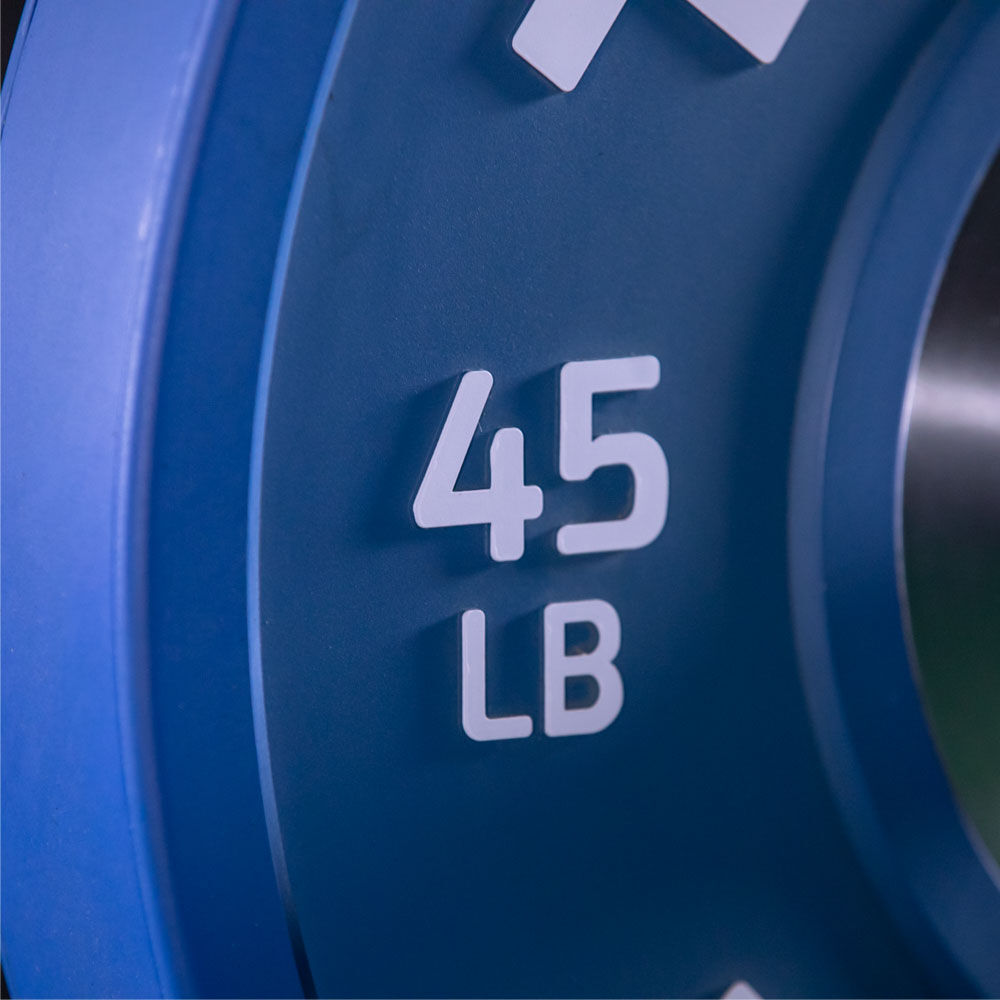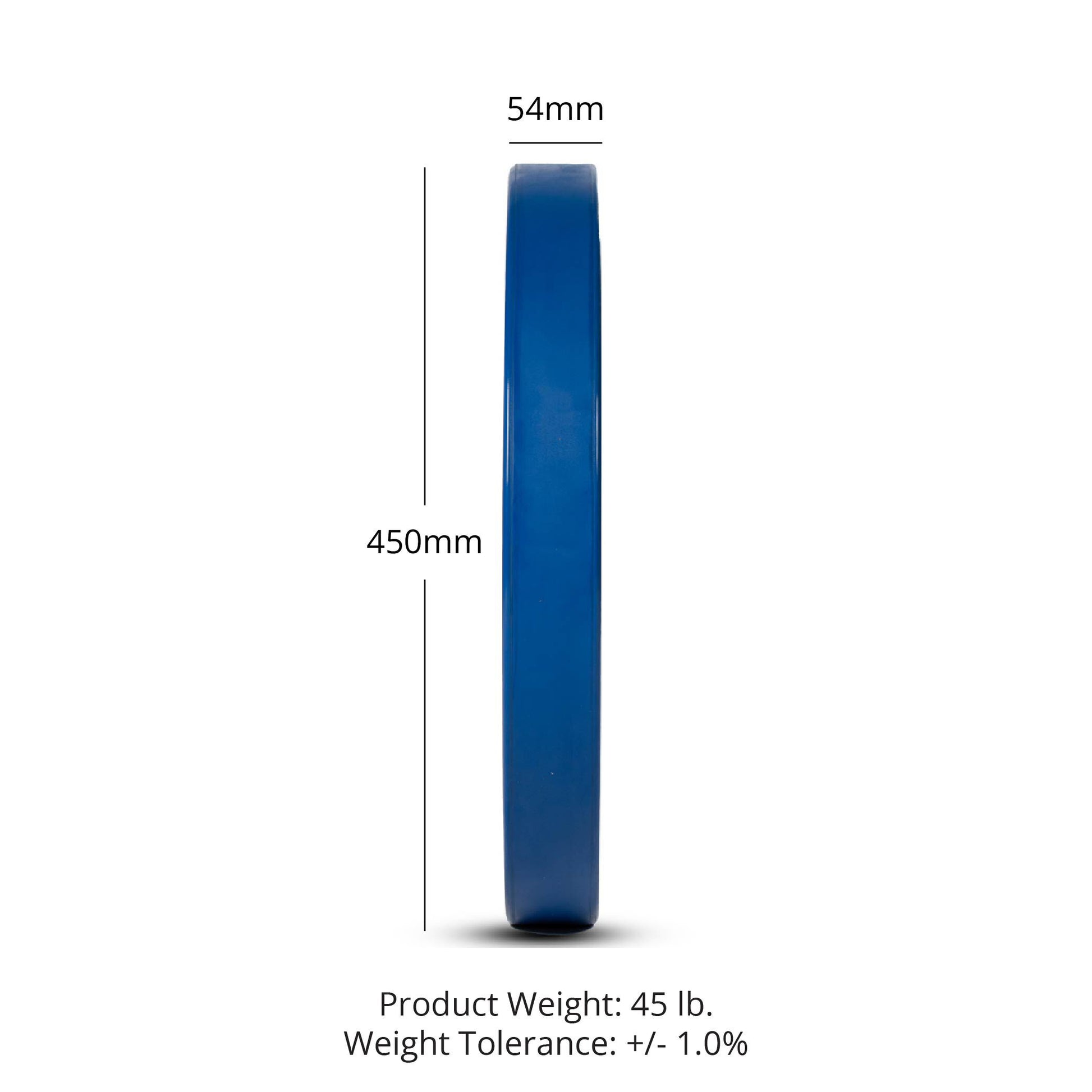 The 45 LB Elite Competition Plates are color-coded to IWF standards, sold individually, and designed with a low bounce rate and raised lip for easy handling.