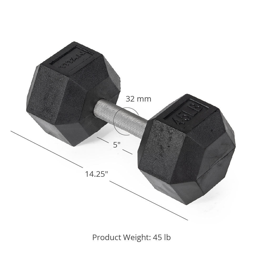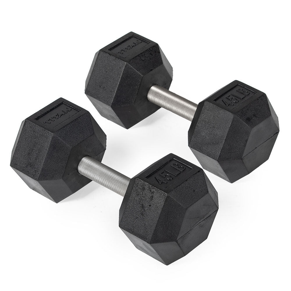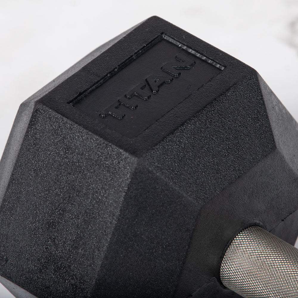 Unleash your inner Titan with the Rubber Coated Hex Dumbbells with stainless steel straight handles. These sturdy weights are premium quality equipment ideal for home and garage gyms. The straight, easy-to-grip handles are crafted from stainless steel and have a knurled texture for a comfortable and firm grip. They are offered in pairs ranging from 5 LB to 120 LB, featuring a 5" straight handle with a 28mm to 32mm diameter. The cast iron hexagonal heads encased in durable black rubber feature embossed weight increments and the TITAN logo on two sides for easy identification. These branded dumbbells are a great addition to any gym, whether you are just starting or a seasoned lifter.