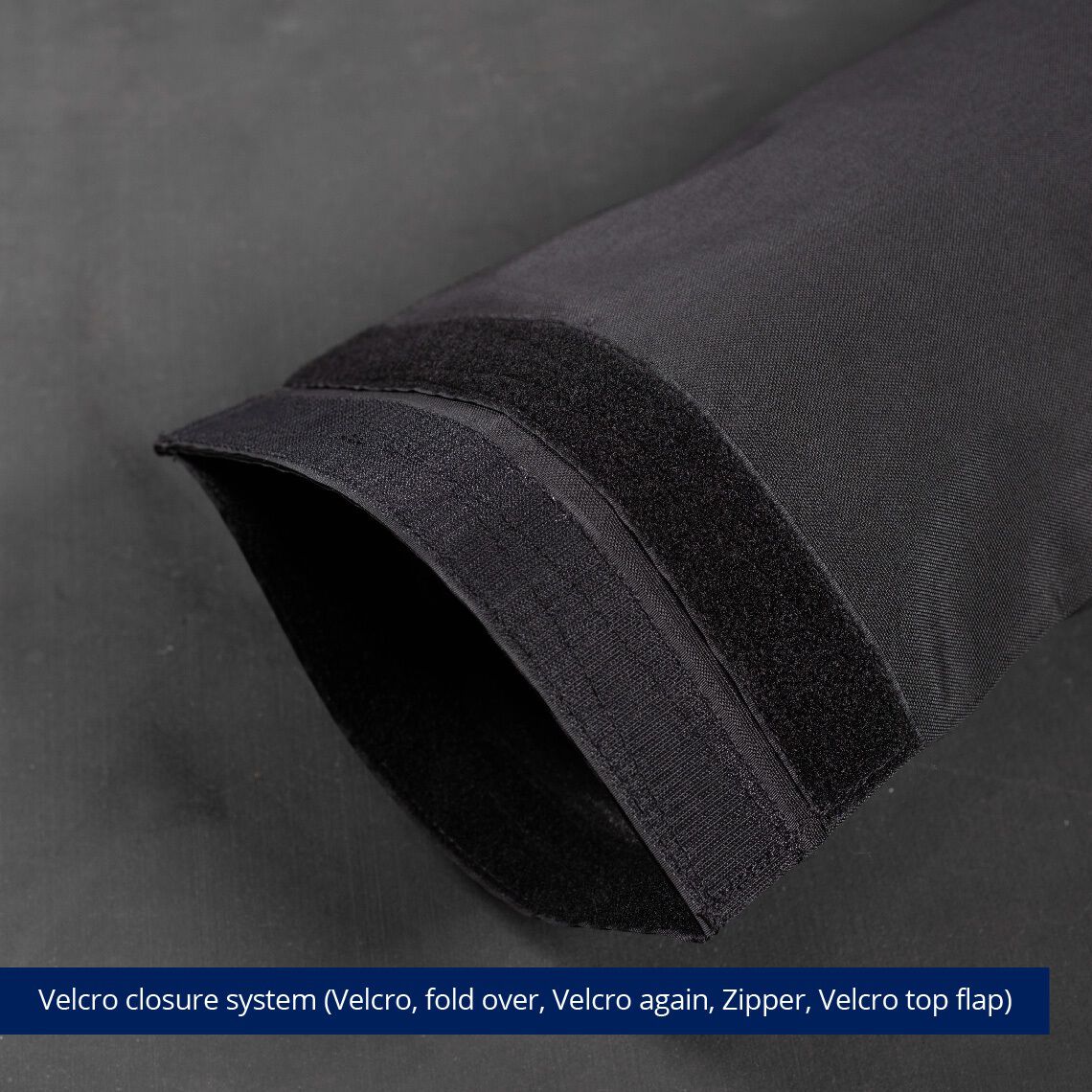 - Velcro closure system (Velcro, fold over, Velcro again, Zipper, Velcro top flap)