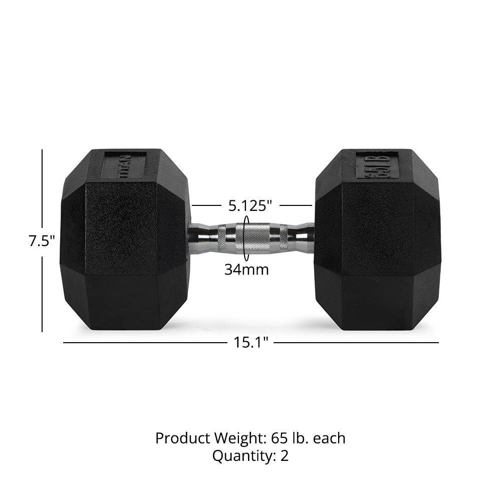 This 65 LB set hex dumbbells are made to stay put with a roll-resistant design, they're perfect for push-ups, renegade rows, and other floor exercises. Use the weight indicators to grab what you need and get to work. Built for intense arm days, these weights have chrome-coated, knurled handles for a solid, slip-resistant grip - and a durable rubber coating to protect the solid steel core and your flooring from wear and tear.
