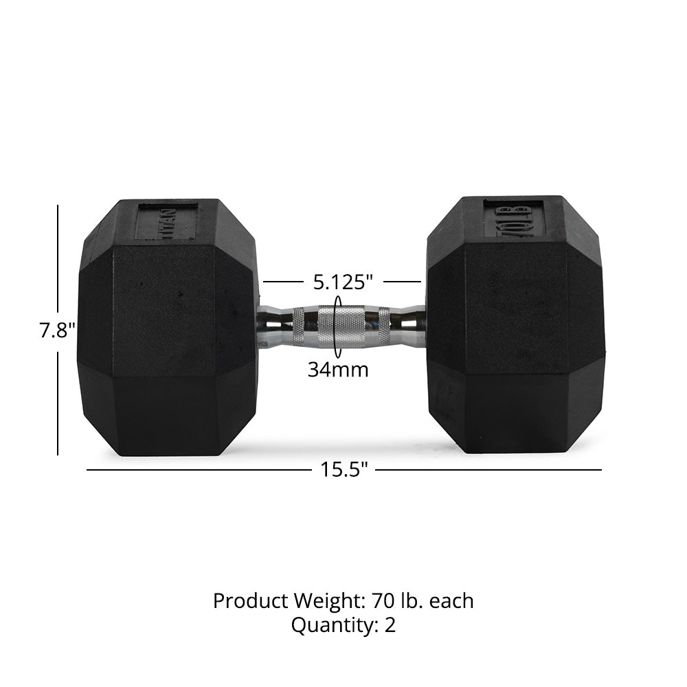 This 70 LB set hex dumbbells are made to stay put with a roll-resistant design, they're perfect for push-ups, renegade rows, and other floor exercises. Use the weight indicators to grab what you need and get to work. Built for intense arm days, these weights have chrome-coated, knurled handles for a solid, slip-resistant grip - and a durable rubber coating to protect the solid steel core and your flooring from wear and tear.