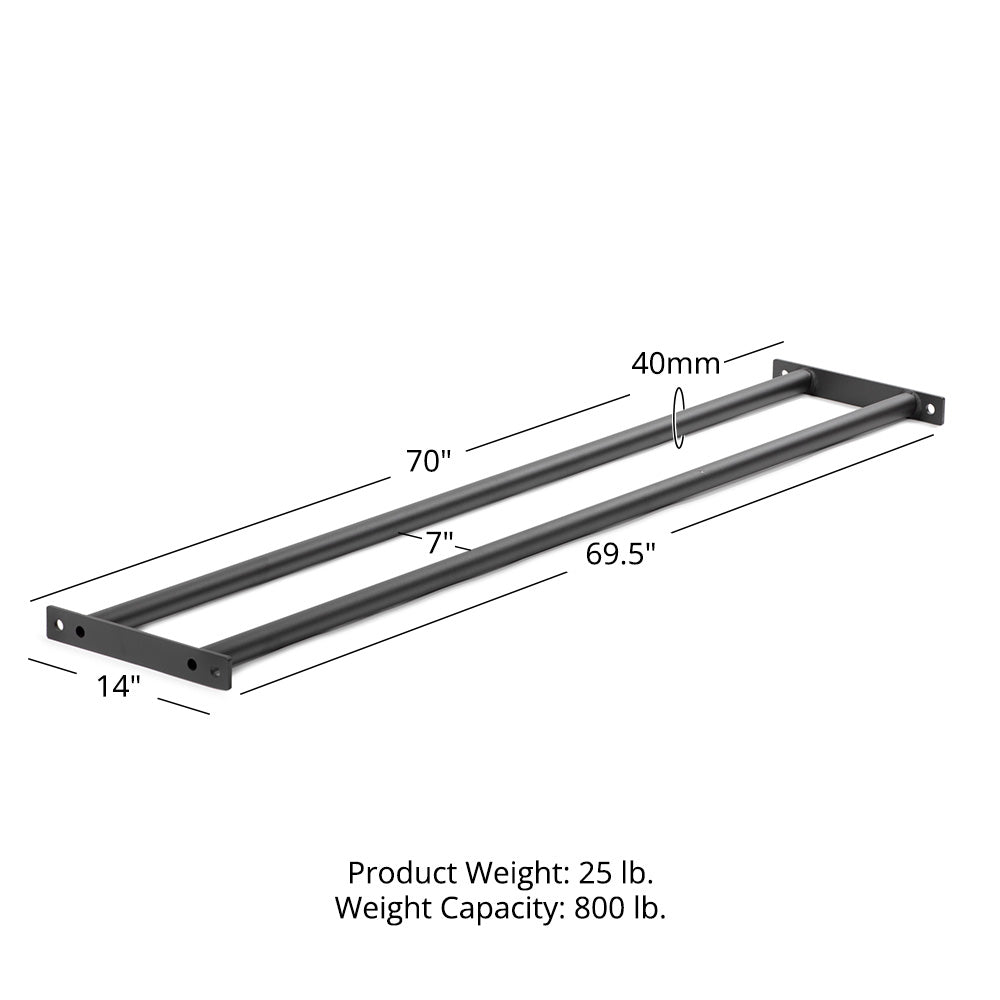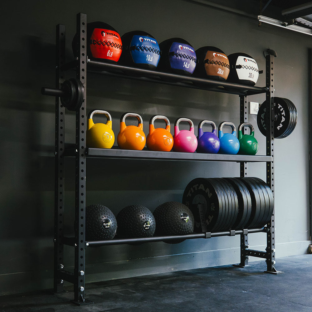Enhance your 2-tier or 3-tier Elite Series Mass Storage System with this bumper plate and medicine ball shelf. Designed to meet the needs of your workout routine, this shelf provides 70" of additional weight storage, supported by two 40mm steel rails spaced 7" apart. It expands your base model storage system into a more comprehensive home gym unit. The shelf easily attaches to the uprights of your base model storage unit with the provided installation hardware, making setup easy.