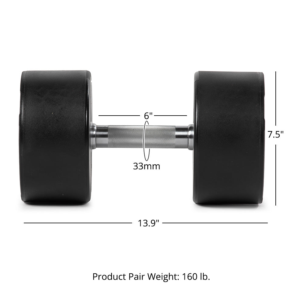 Perfect for powering through a range of exercises like curls, rows, and kickbacks, these 80 LB round dumbbells are ideal for dynamic movements like rollouts and renegade rows. With a rugged black urethane coating that outlasts traditional rubber dumbbells, they're odorless and tough enough to withstand heavy drops, keeping their shape and appearance intact for longer. 33mm hard chrome handles and medium volcano knurling ensure a rock-solid grip through every lift while bold, easy-to-read weight indicators make quick identification simple during intense workouts.
