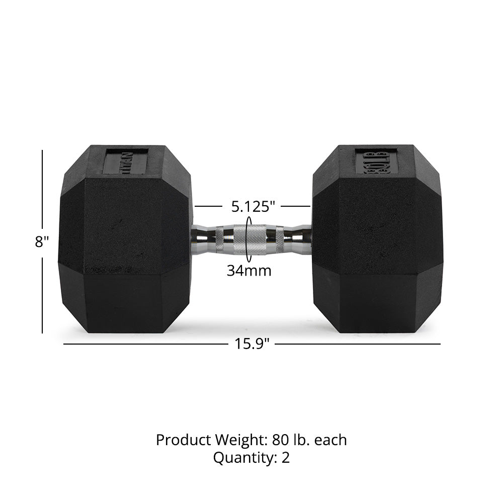 This 80 LB set hex dumbbells are made to stay put with a roll-resistant design, they're perfect for push-ups, renegade rows, and other floor exercises. Use the weight indicators to grab what you need and get to work. Built for intense arm days, these weights have chrome-coated, knurled handles for a solid, slip-resistant grip - and a durable rubber coating to protect the solid steel core and your flooring from wear and tear.