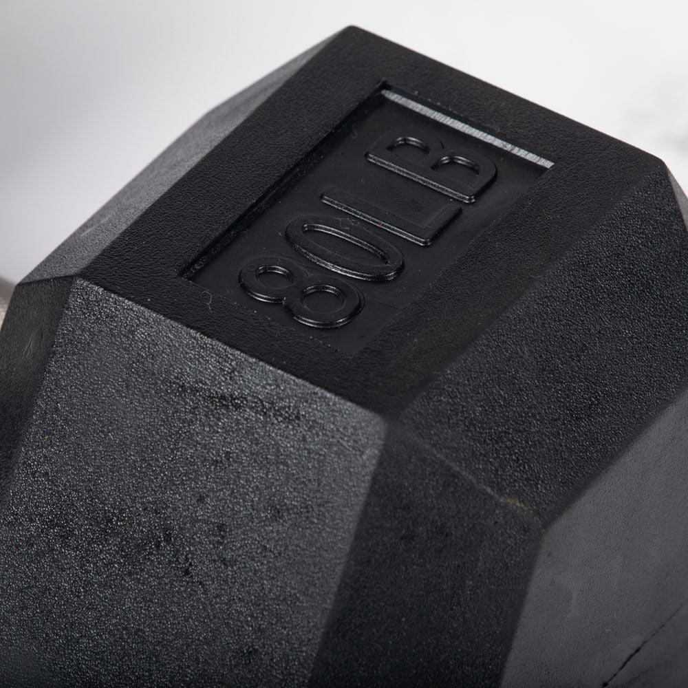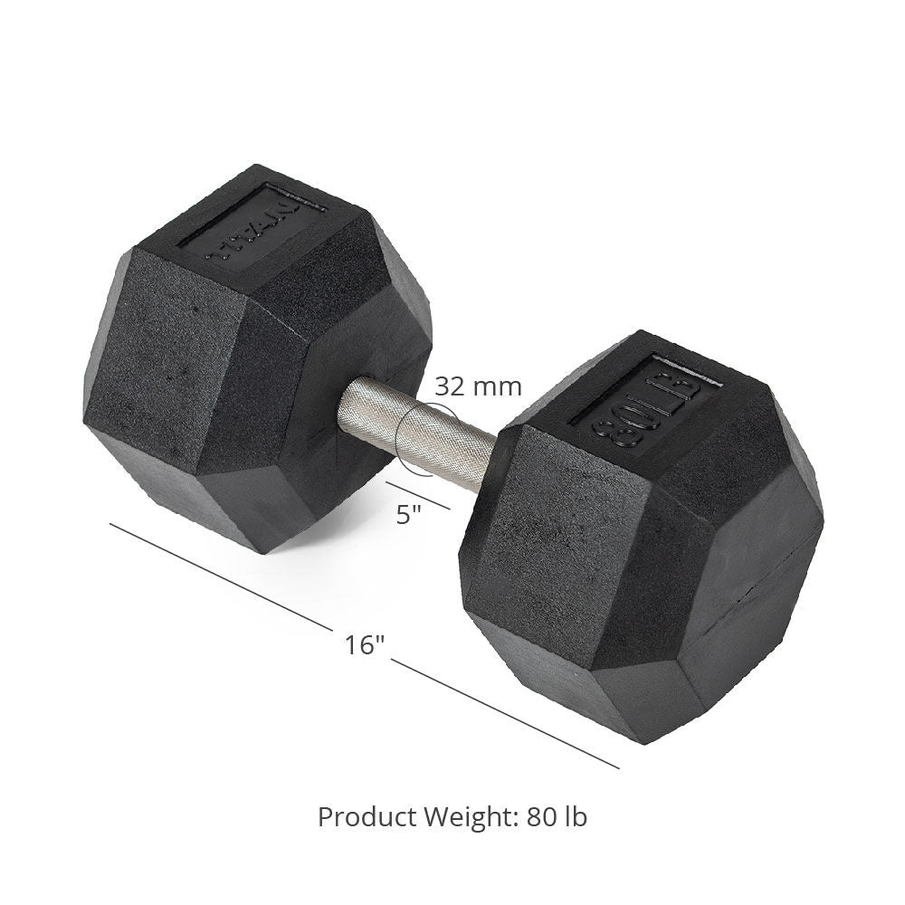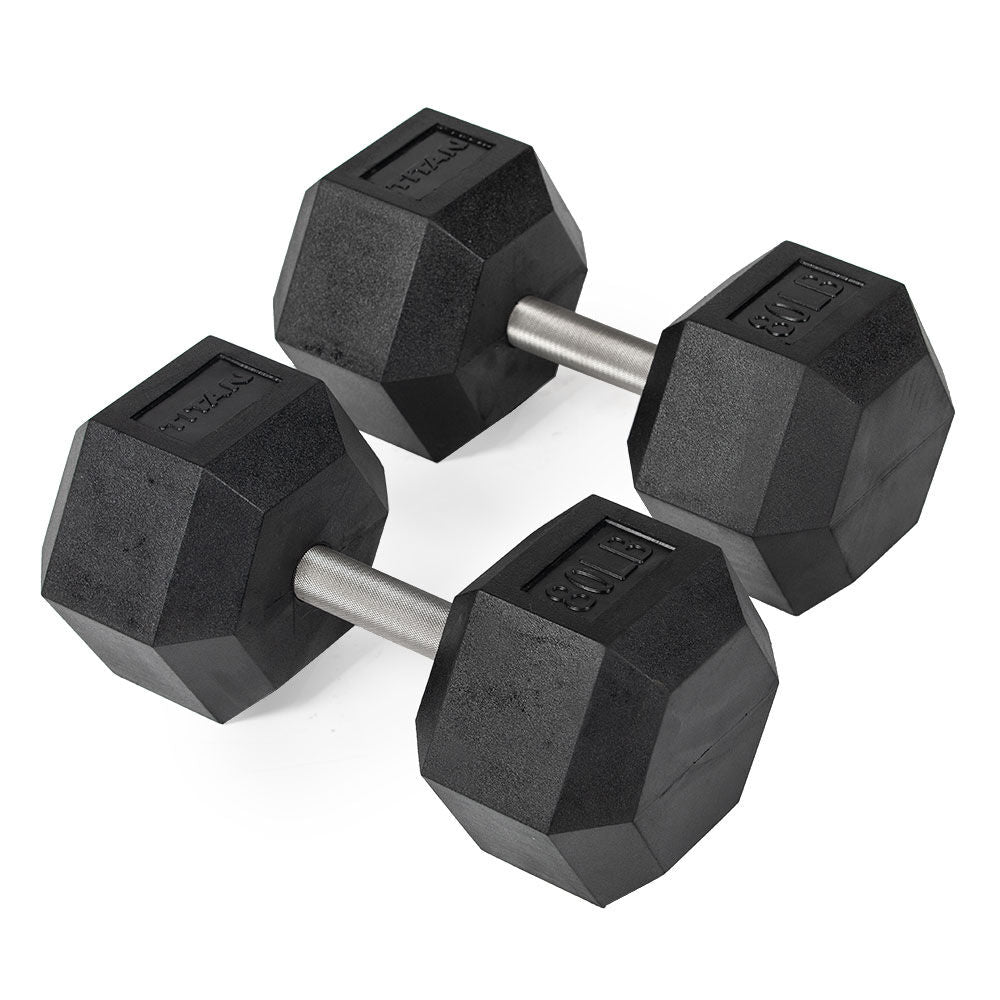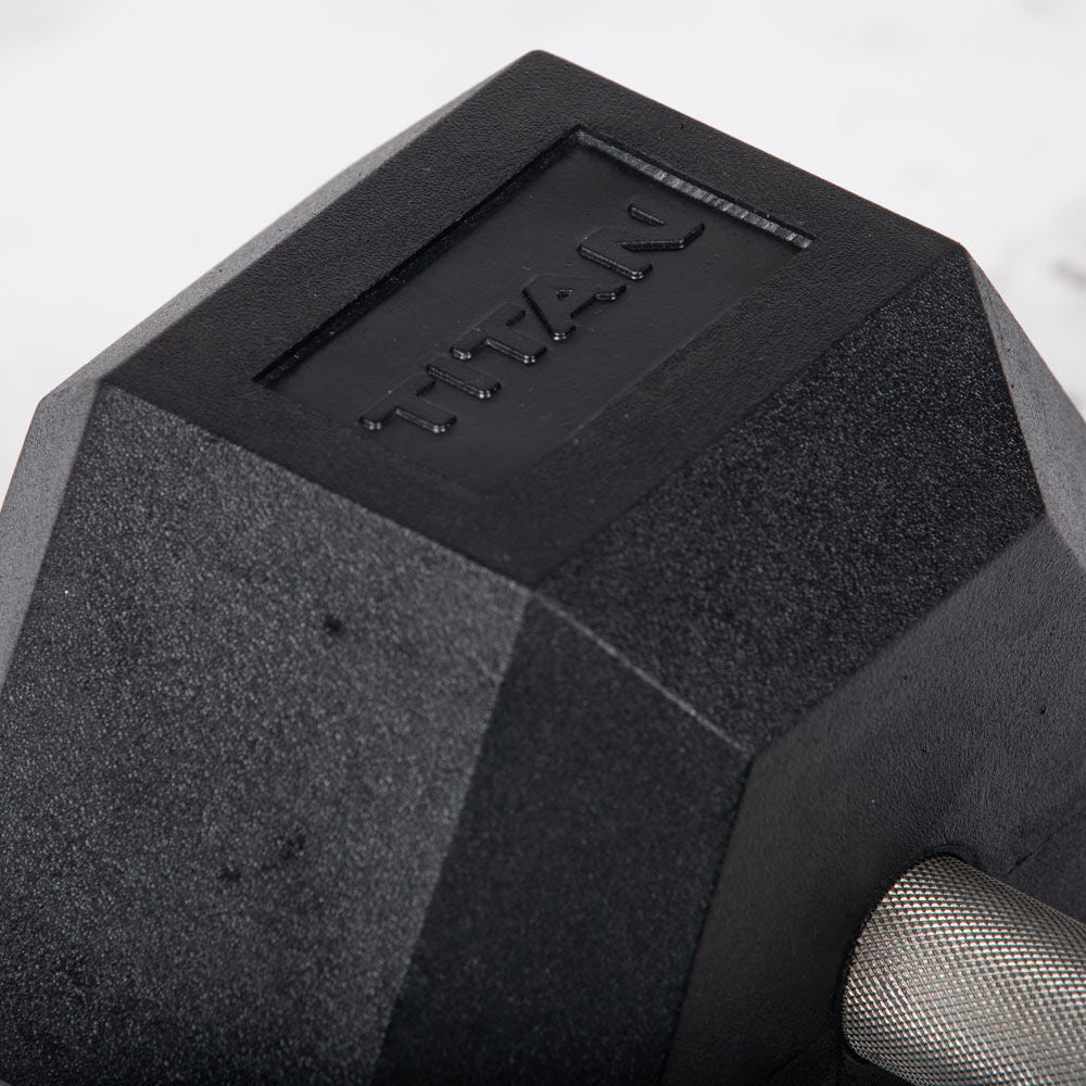 Unleash your inner Titan with the Rubber Coated Hex Dumbbells with stainless steel straight handles. These sturdy weights are premium quality equipment ideal for home and garage gyms. The straight, easy-to-grip handles are crafted from stainless steel and have a knurled texture for a comfortable and firm grip. They are offered in pairs ranging from 5 LB to 120 LB, featuring a 5" straight handle with a 28mm to 32mm diameter. The cast iron hexagonal heads encased in durable black rubber feature embossed weight increments and the TITAN logo on two sides for easy identification. These branded dumbbells are a great addition to any gym, whether you are just starting or a seasoned lifter.