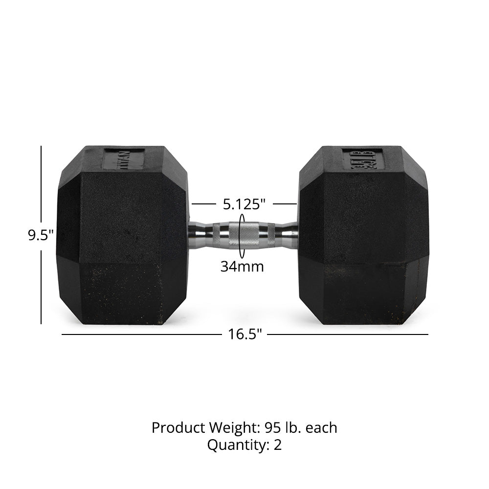 This 95 LB set hex dumbbells are made to stay put with a roll-resistant design, they're perfect for push-ups, renegade rows, and other floor exercises. Use the weight indicators to grab what you need and get to work. Built for intense arm days, these weights have chrome-coated, knurled handles for a solid, slip-resistant grip - and a durable rubber coating to protect the solid steel core and your flooring from wear and tear.