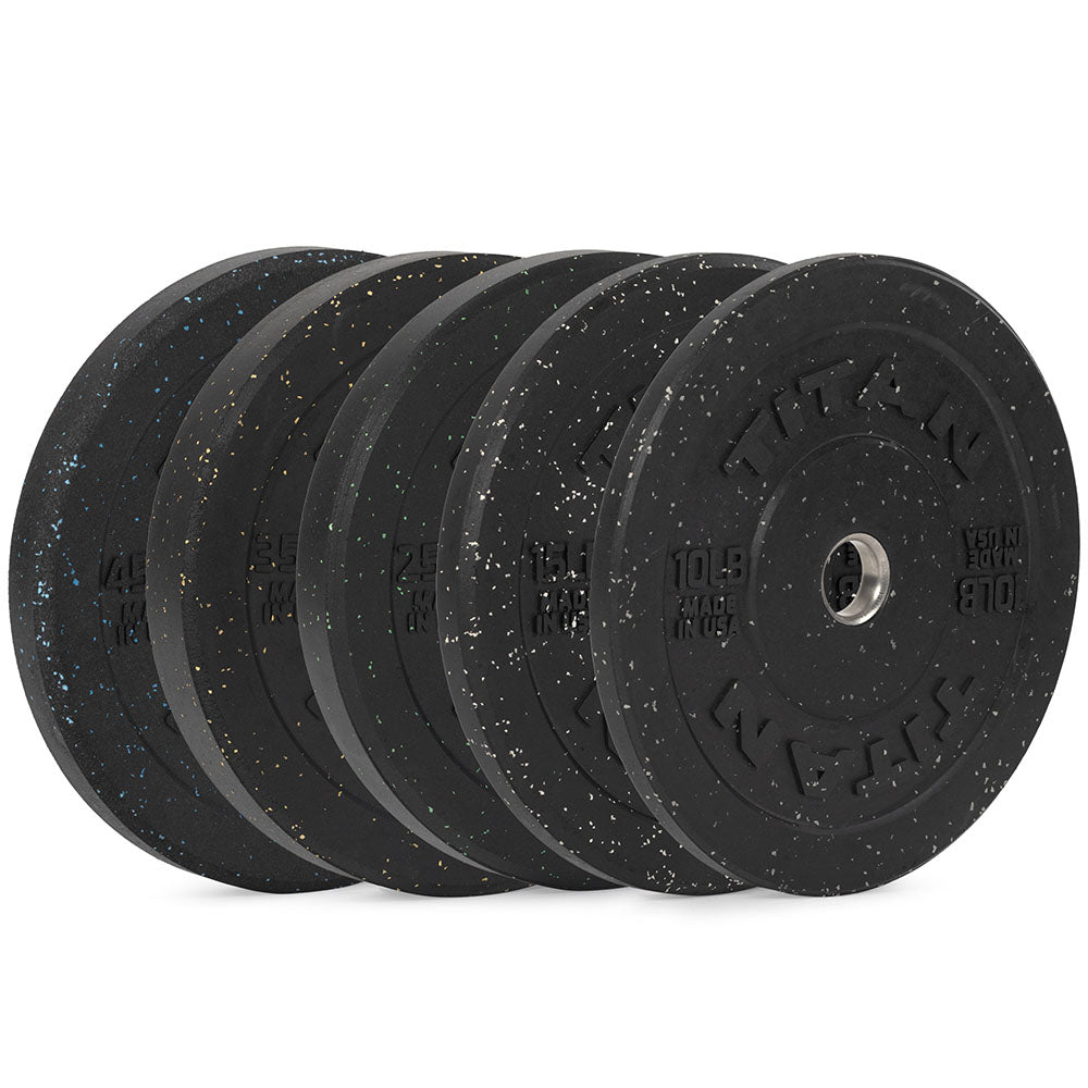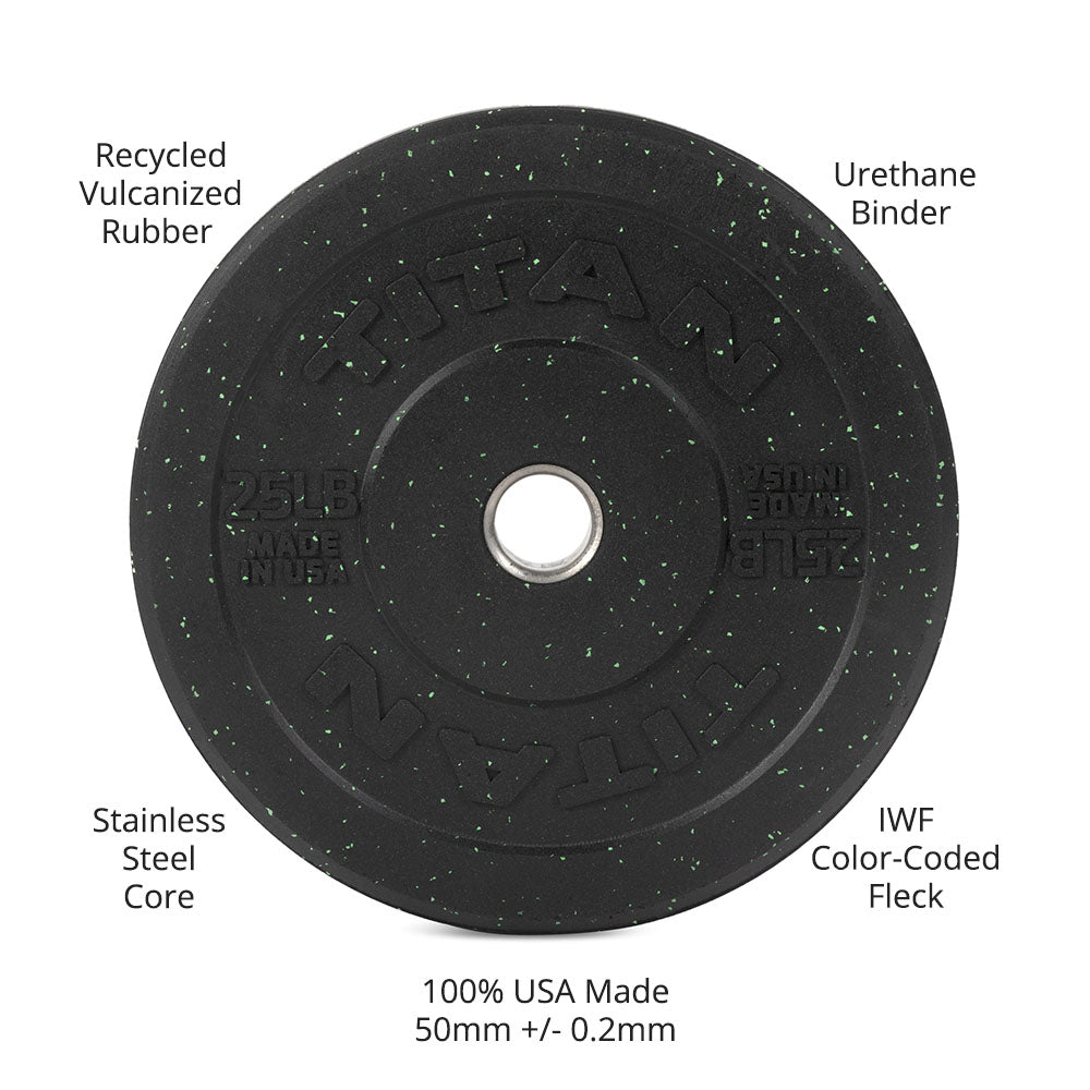 100% made in the USA, these crumb rubber bumper plates are built with a seriously strong combination of recycled vulcanized rubber and a proprietary urethane binder for exceptional durability. Each plate features a 2" stainless-steel collar insert for added strength and longevity.