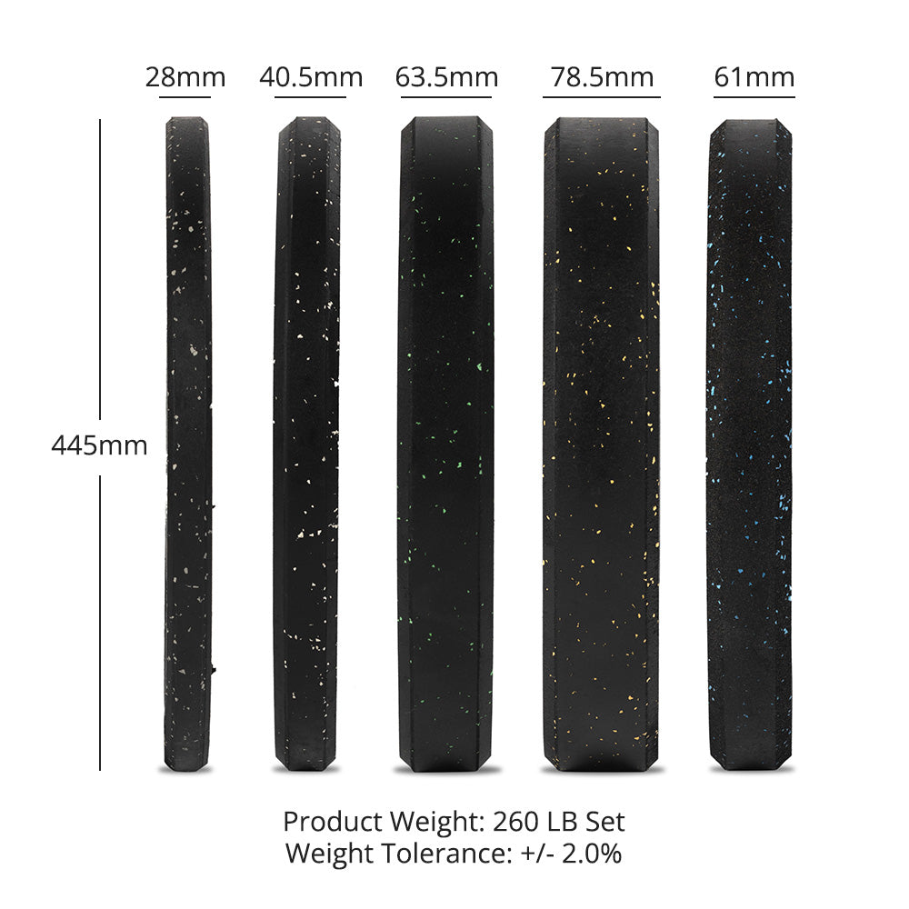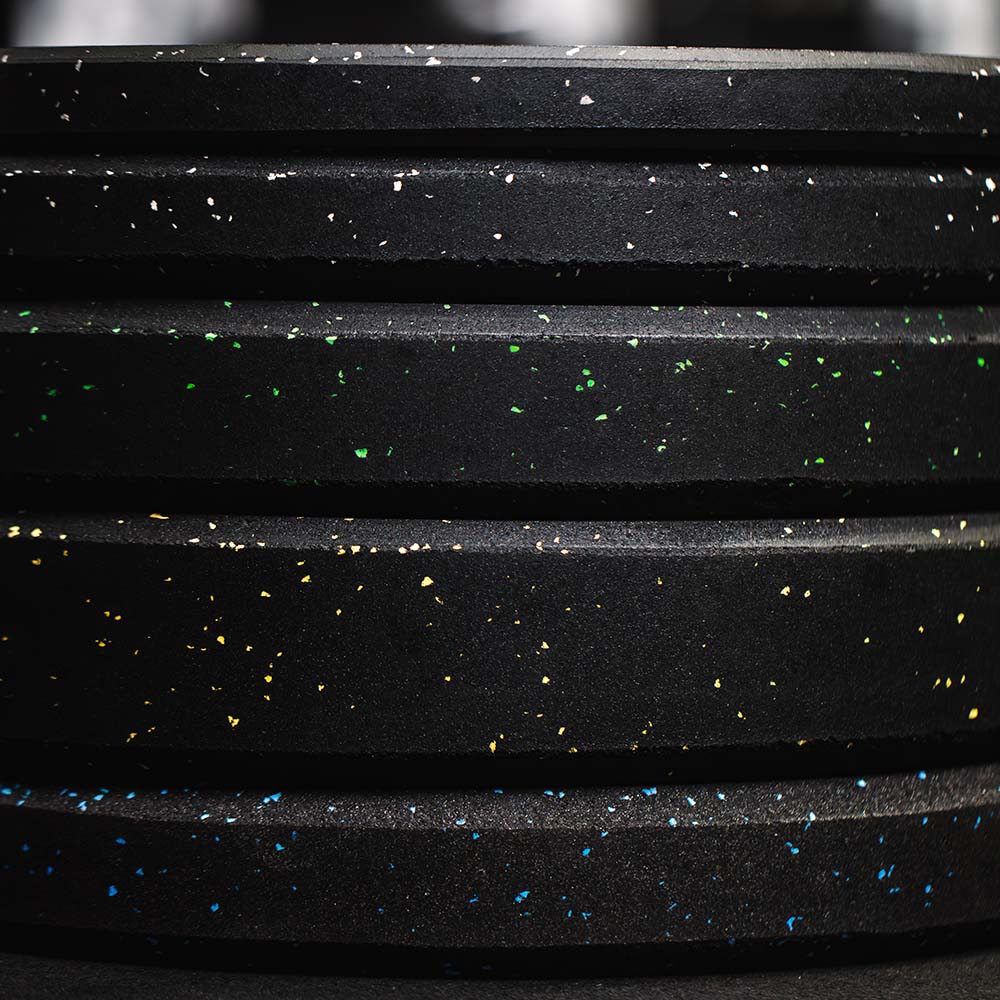 These weight plates are fleck color-coded to IWF (International Weightlifting Federation) standards and have easy-to-read indicators for quick identification - along with a raised lip for easy handling when loading onto your bar.