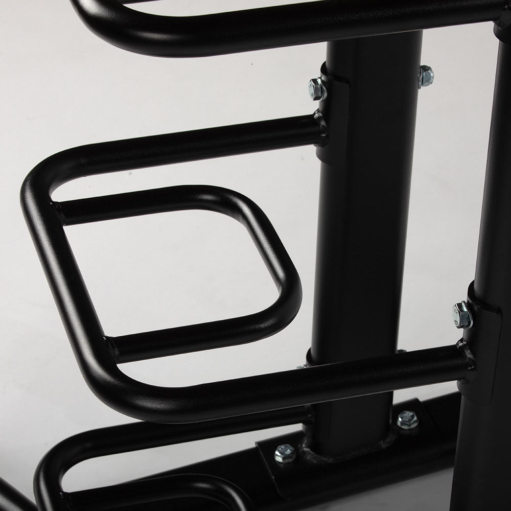 The Functional Swing Bag Rack is designed to organize five crescent-shaped Functional Training Swing Bags in a sturdy steel storage unit. This space-saving floor rack has five steel tube shelves with 9.5" of space between each. With a compact footprint of 23" x 26.5", this vertical storage solution enhances the organization and efficiency of your home or garage gym training space, ensuring easy access to the bags.