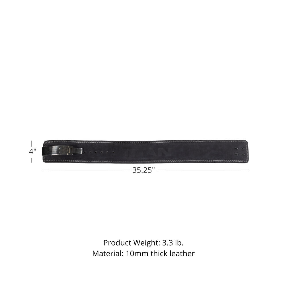 The Small 10mm Lever Belt utilizes the lock-in lever design in place of the single prong buckle like our MAXXUM Lifting Belts. This black laminated leather Powerlifting belt is durable, four inches wide, providing firm support through heavy lifts. Crafted with seven adjustable holes spaced 1-inch apart, this 21 to 28-inch belt features a stainless-steel lock-in lever and an embossed TITAN logo printed on the back of the belt. Clean design, secure fit, this small Lever Belt is built to last through every Deadlift, Squat, or Bent-Over Rows you perform in it.
