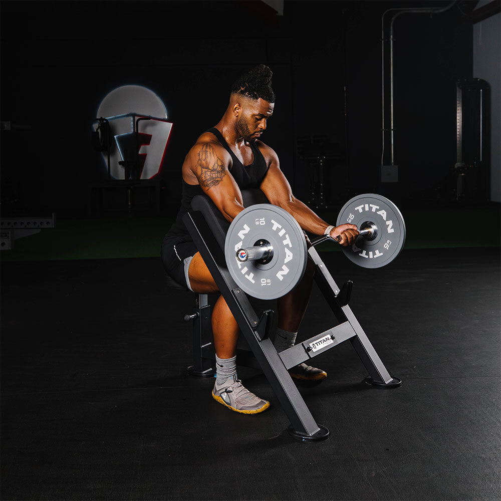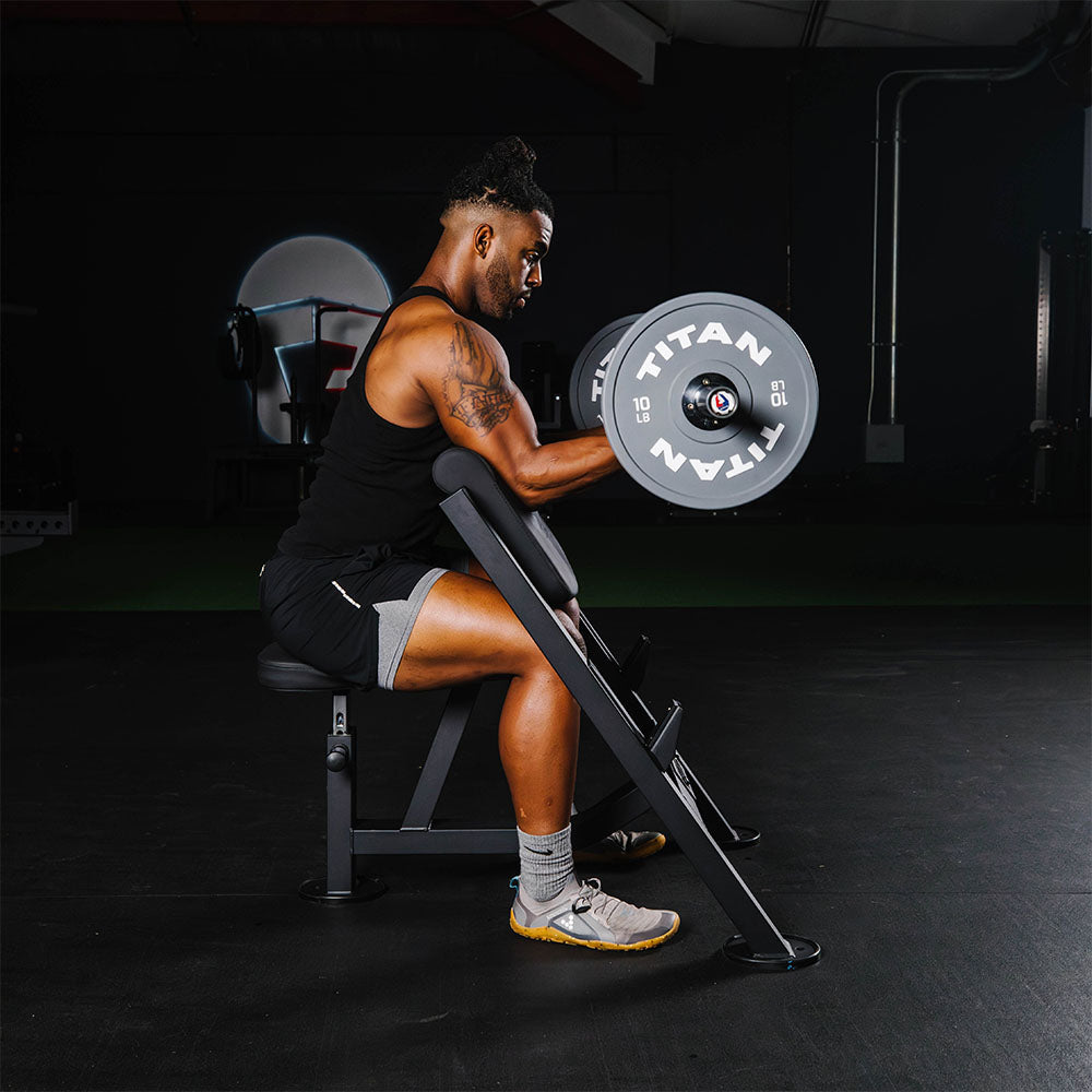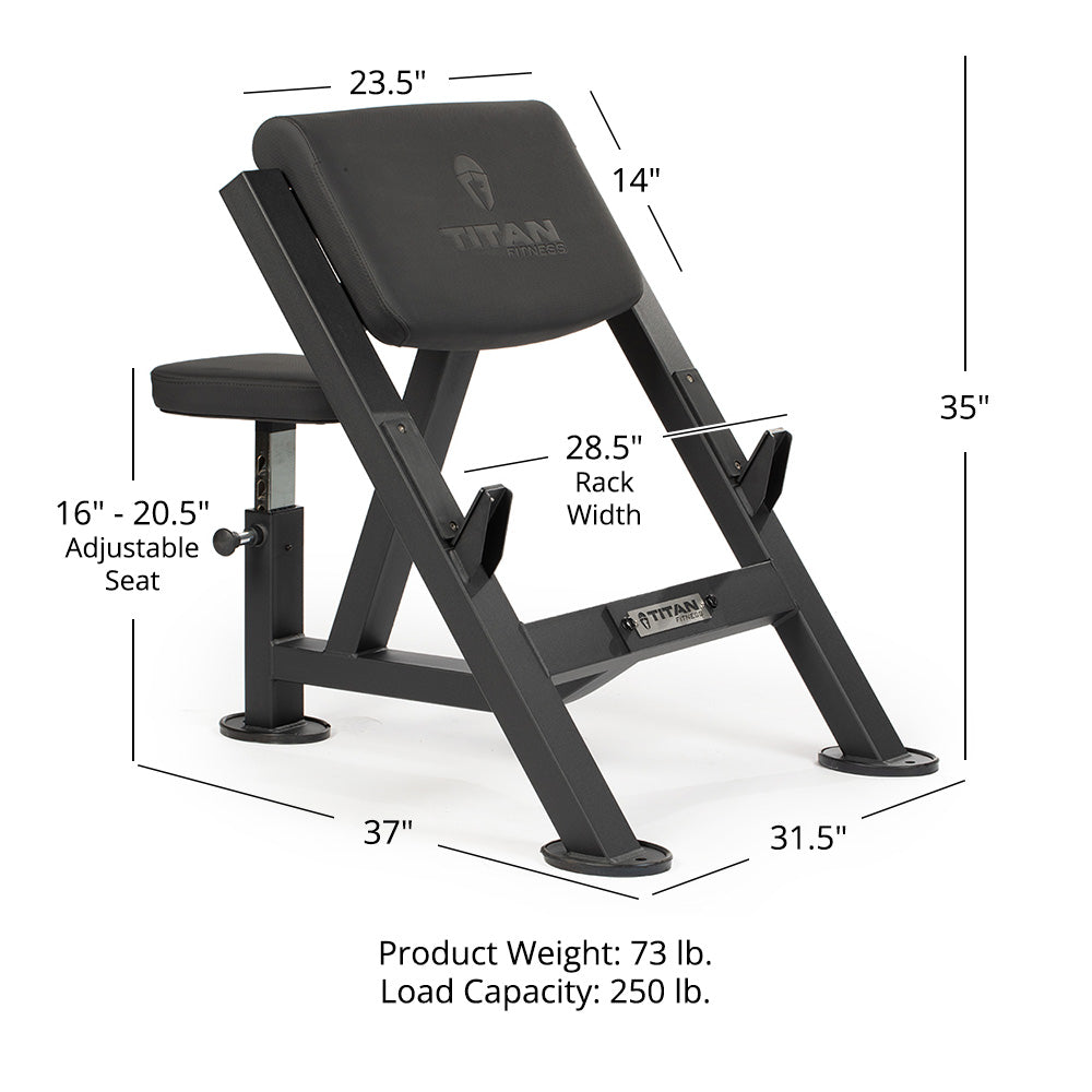 The Preacher Curl Bench is a fantastic exercise platform to improve your curling form and target your biceps. Built out as a fully functional specialty bench that supports great mass-building movements for building up your biceps utilizing dumbbells, barbells, and EZ curl bars. The curl station is built from sturdy steel and includes two plastic-lined J-hooks that hold a max load of up to 250 LB. The bench and armrest feature high-density contour foam padding with durable HeftyGrip Vinyl upholstery, a smooth transition adjustable bench, and rubber feet to protect floors and provide a stable base. Secure, stable, and exceptionally functional, the Preacher Curl Bench is ready for BIG gains and toned biceps.