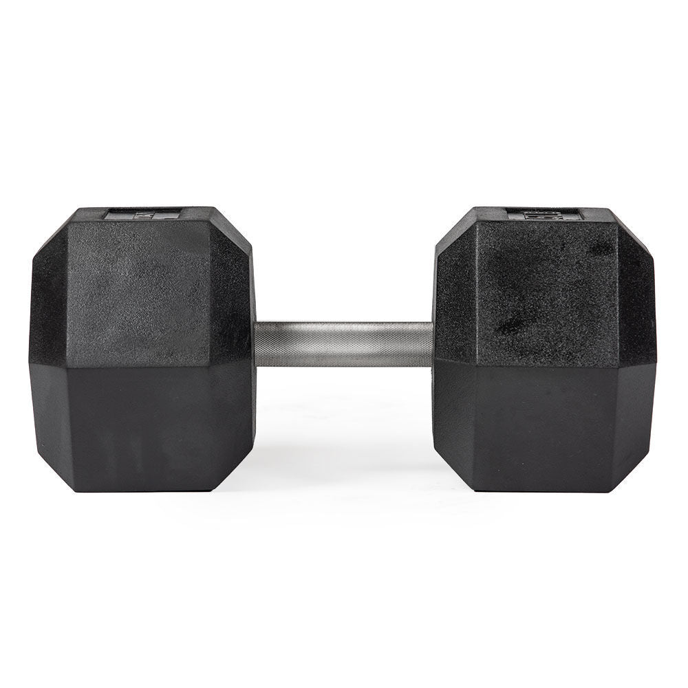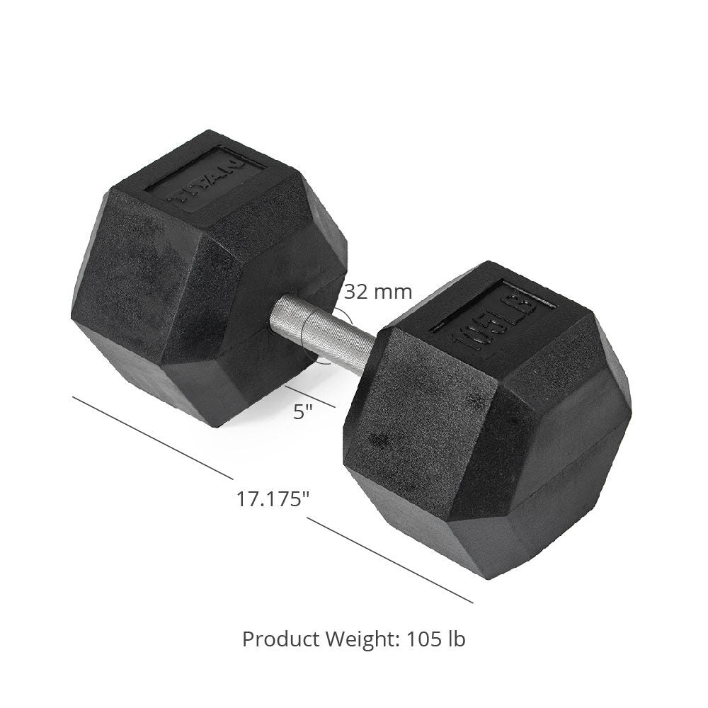 The 105 LB Rubber Coated Hex Dumbbells are sold in pairs and feature straight stainless steel handles, and TITAN branded hexagonal heads with embossed weight indications.