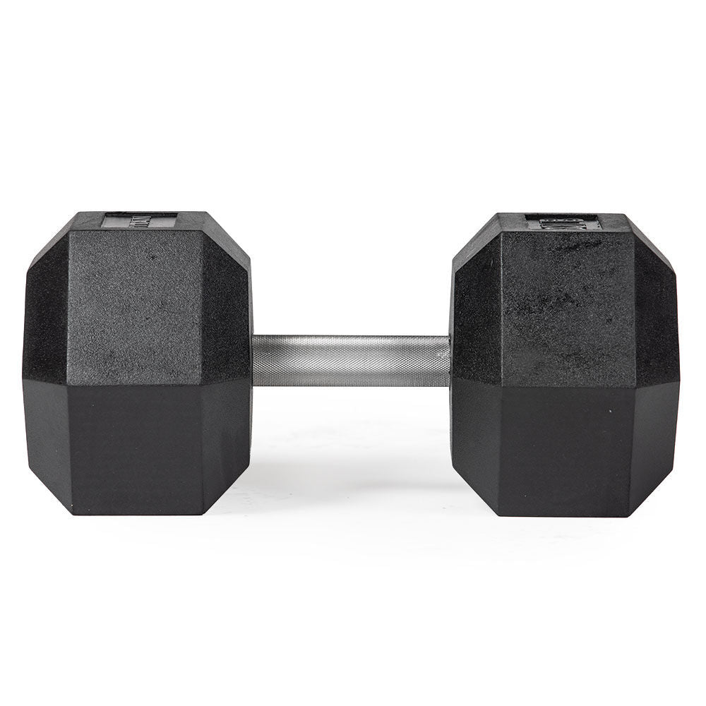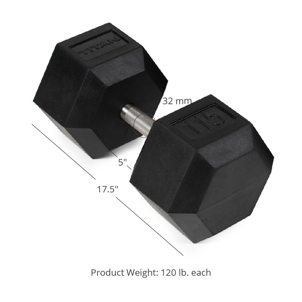 The 120 LB Rubber Coated Hex Dumbbells are sold in pairs and feature straight stainless steel handles, and TITAN branded hexagonal heads with embossed weight indications.
