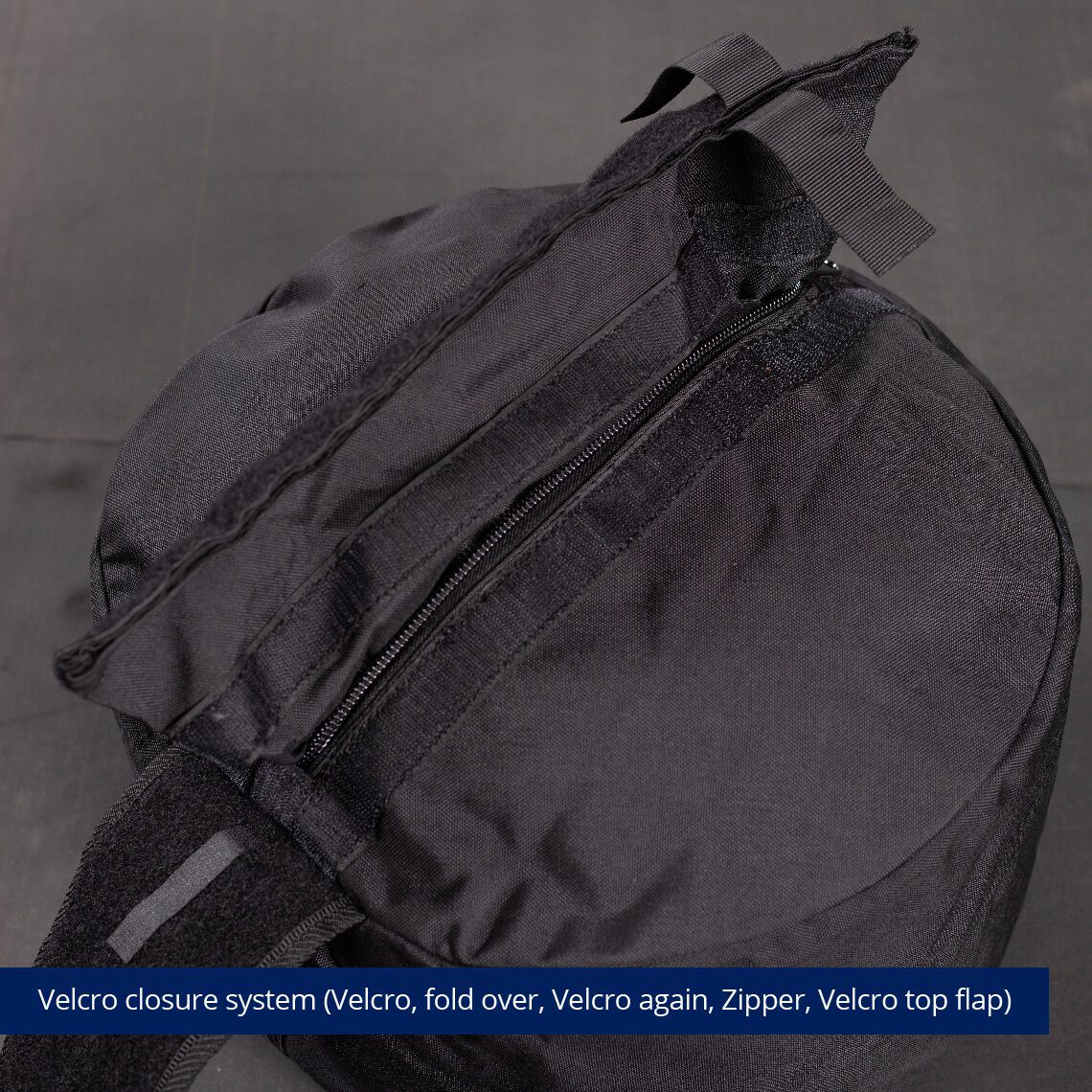 - Velcro closure system (Velcro, fold over, Velcro again, Zipper, Velcro top flap)