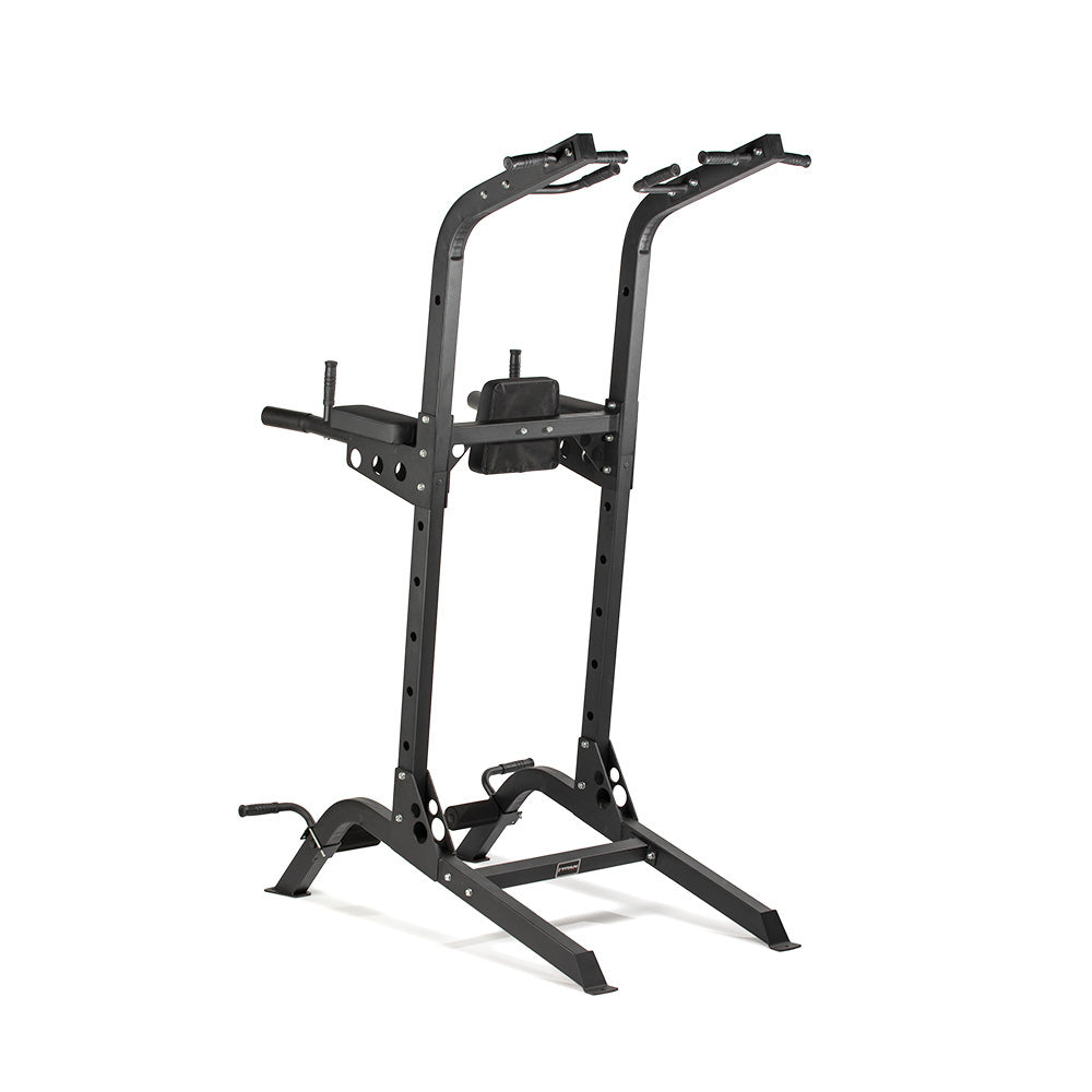 Supercharge your functional strength with this all-in-one power tower. This versatile tower provides a full-body workout with the compact footprint of one machine. Featuring a pull-up station with multiple grip options, this home gym tower targets different muscle groups depending on your grip. An elevated and adjustable push-up station features 7 mounting positions for a variety of sit-up and push-up exercises. And the built-in dip station has 2" dip bars to develop upper body strength with a solid, shake-free design. Finally, target your core, hip flexors, and quads with the vertical knee raise station. This unit is constructed with heavy duty steel and comfortable back and arm pads.