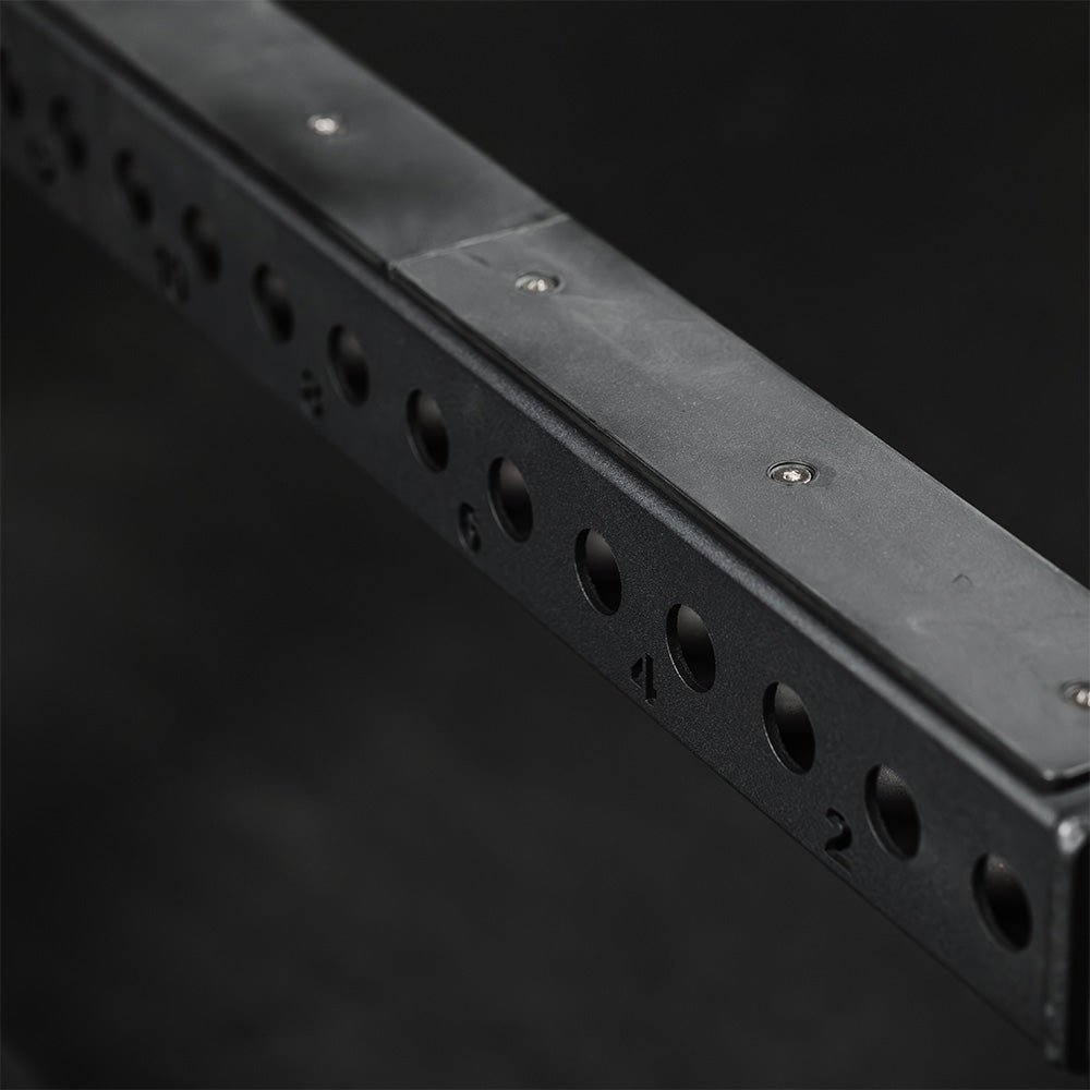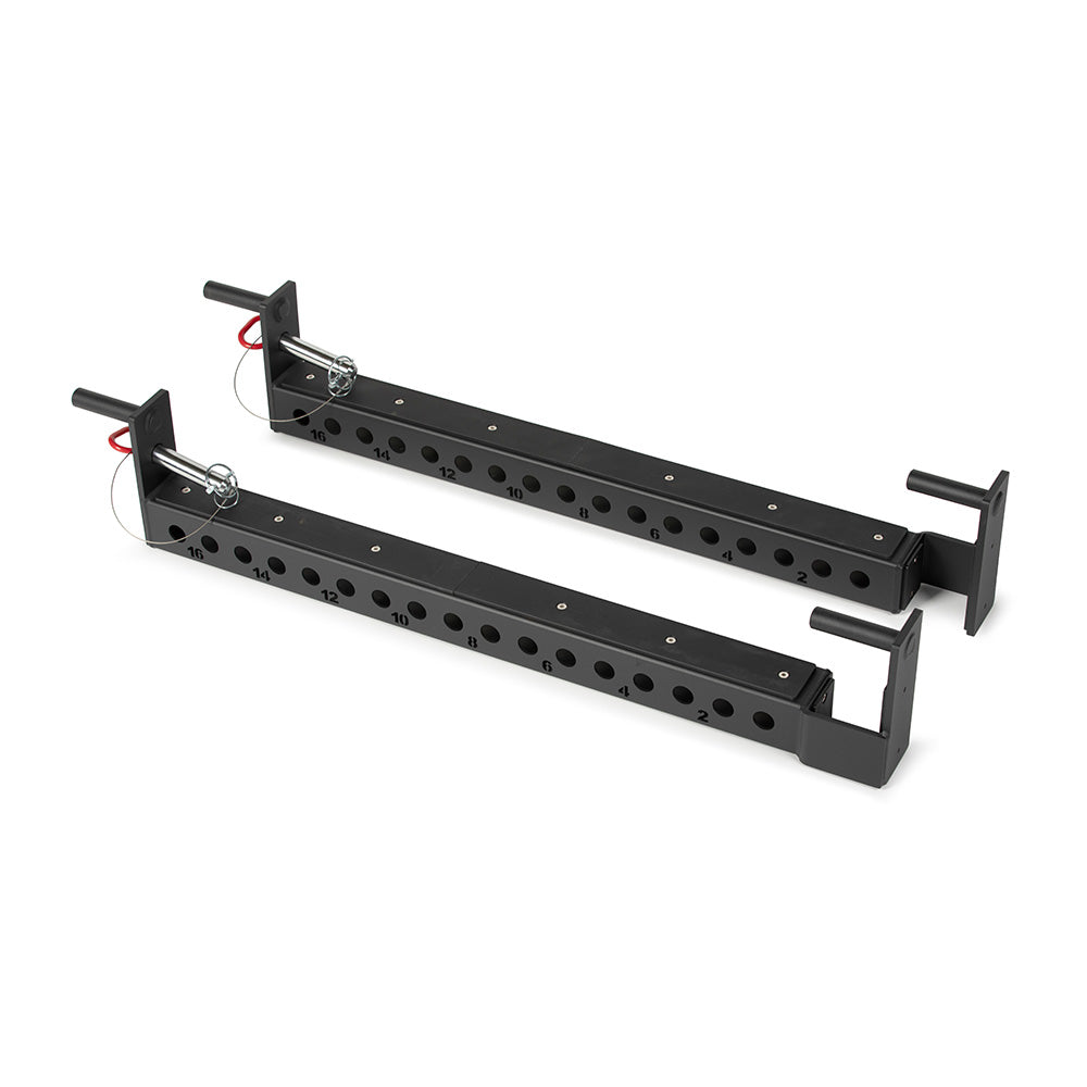 These flip down safety bars fit the TITAN Series 90" or 100" power racks. And raising and lowering your safeties to the ideal height has never been easier. Simply slide them into your uprights with the J-cup mounting style and lock them into place with the pin, then flip them down to fully secure in seconds. Plus, these safety catches double as a band peg pulling platform for more of a challenge. Each bar features laser cut numbers every 2" for band peg placement and a weight capacity of 3,000 LB. Constructed with 3" x 3" 11-gauge steel, they feature a tough protective durable molded nylon liner that spans the top of the entire safety bar to reduce noise and protect both your barbell's knurling and your power rack's uprights.