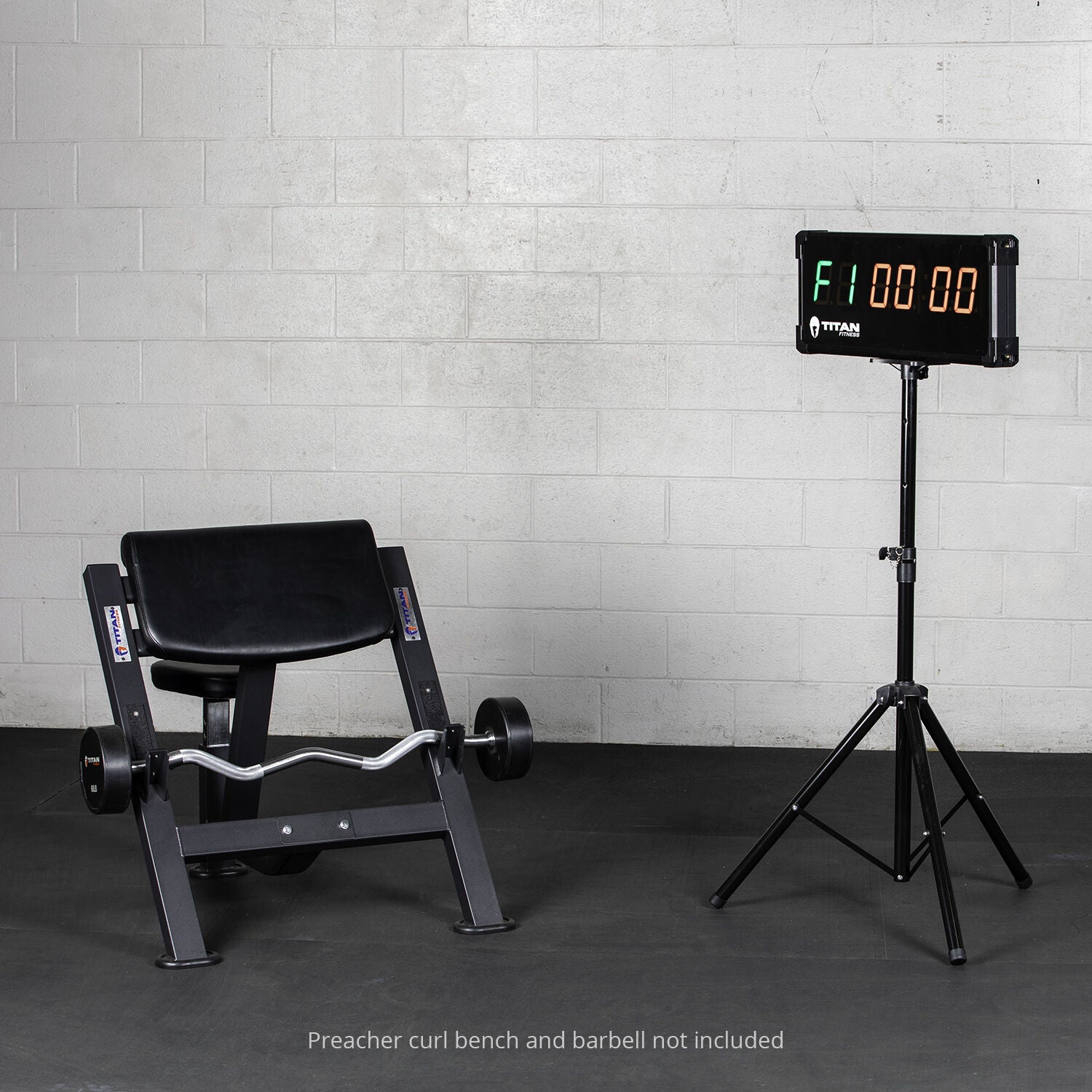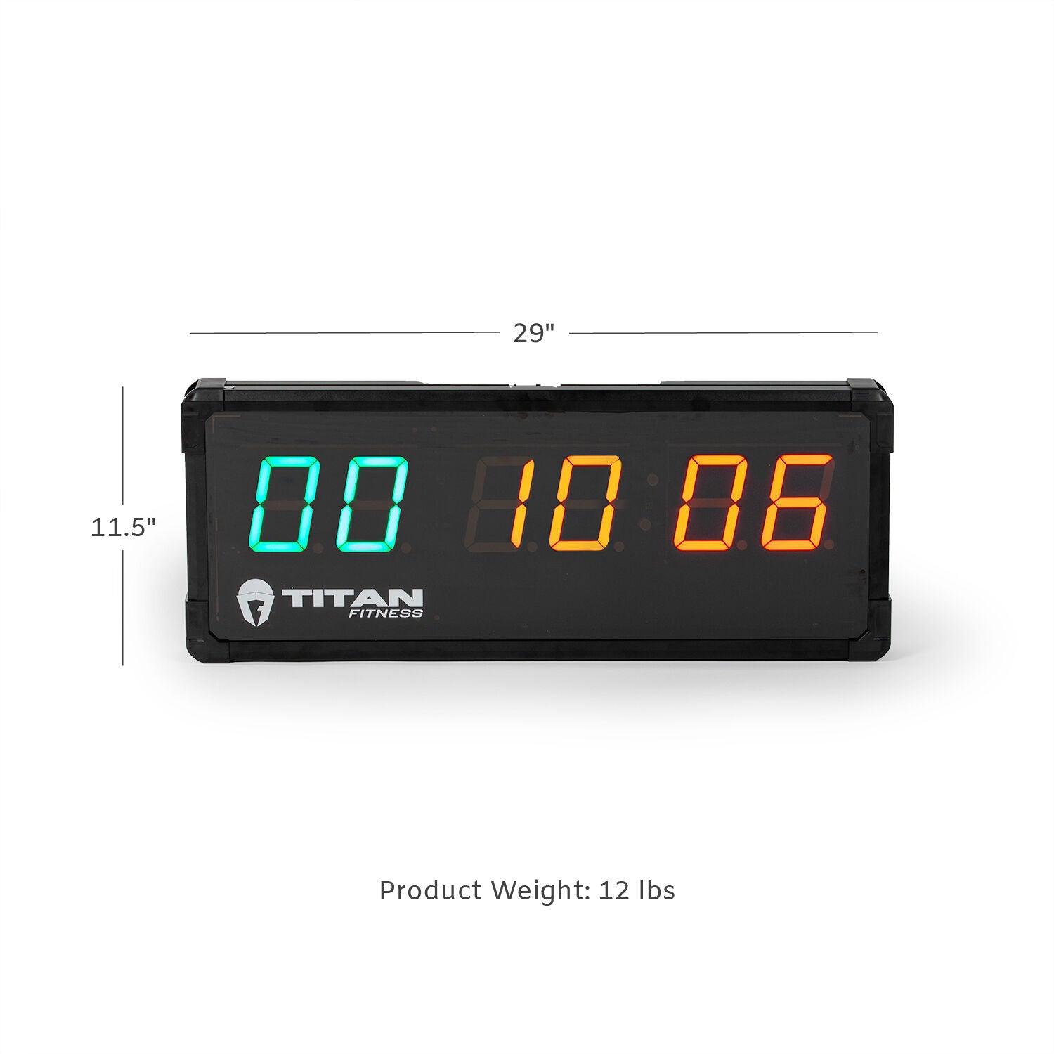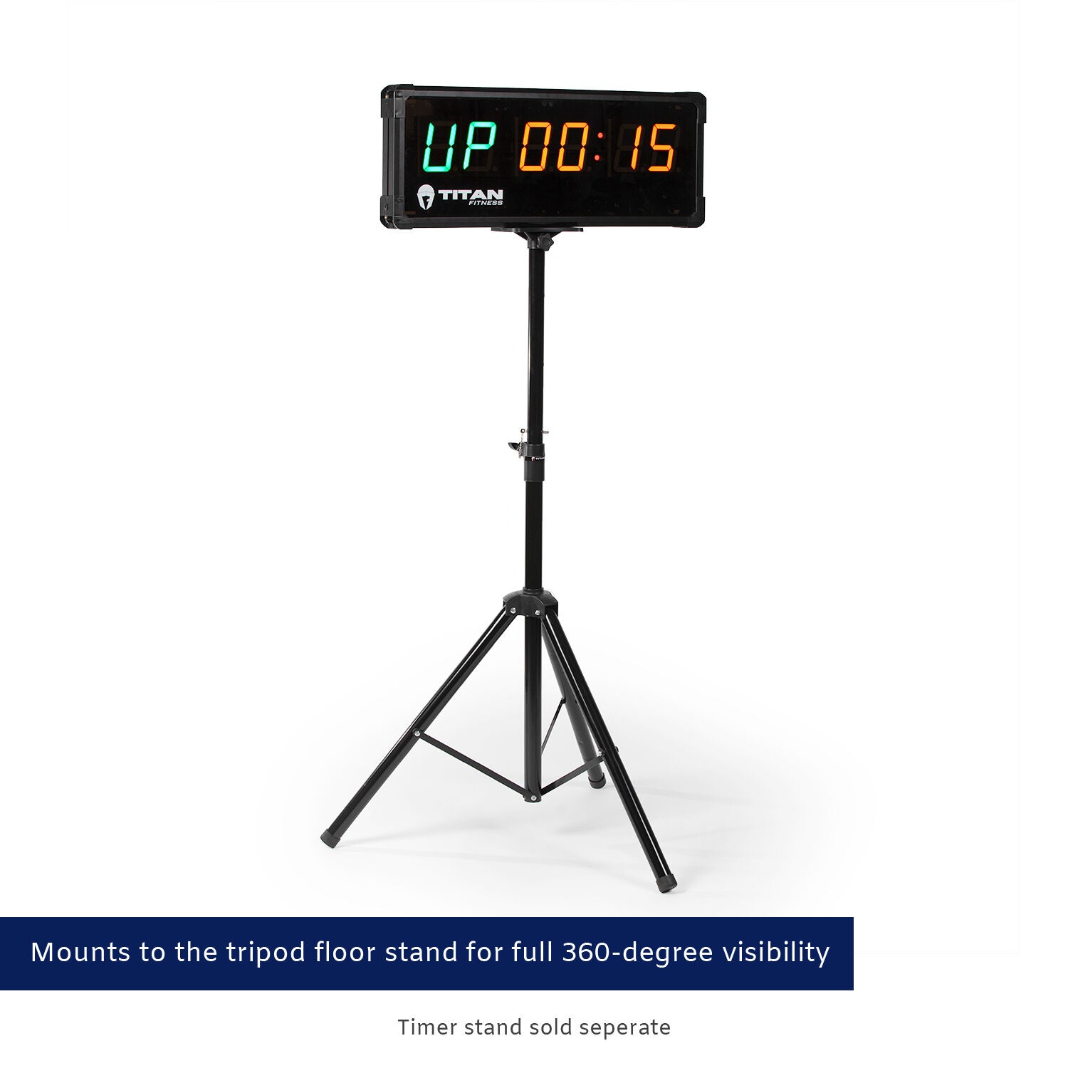 The Titan Fitness® 2-Sided Gym Timer is a must-have for any gym, trainer, or athletic facility. The clock features front and back 4-inch high LED displays, remote control access, and over 10-pre-set and programmable settings. Easily mount the timer on the Titan Fitness Tripod Timer Stand for a nearly full 360-degree visibility (tripod sold separately). The LED display is easily readable from a distance, and the included remote allows coaches, trainers, or athletes to pause, start, or adjust the workout from their workstation.