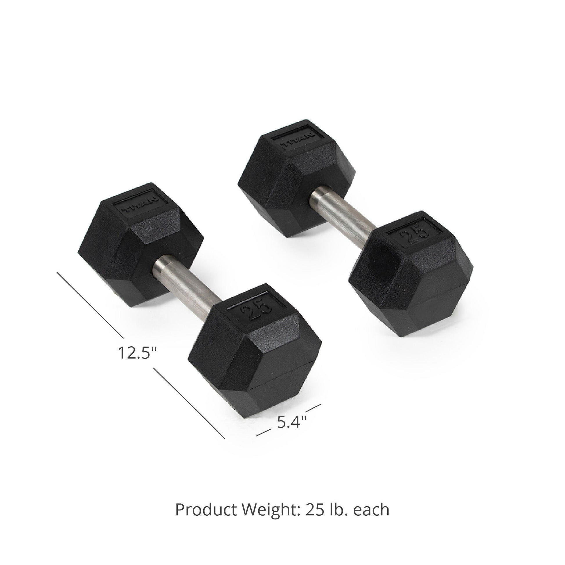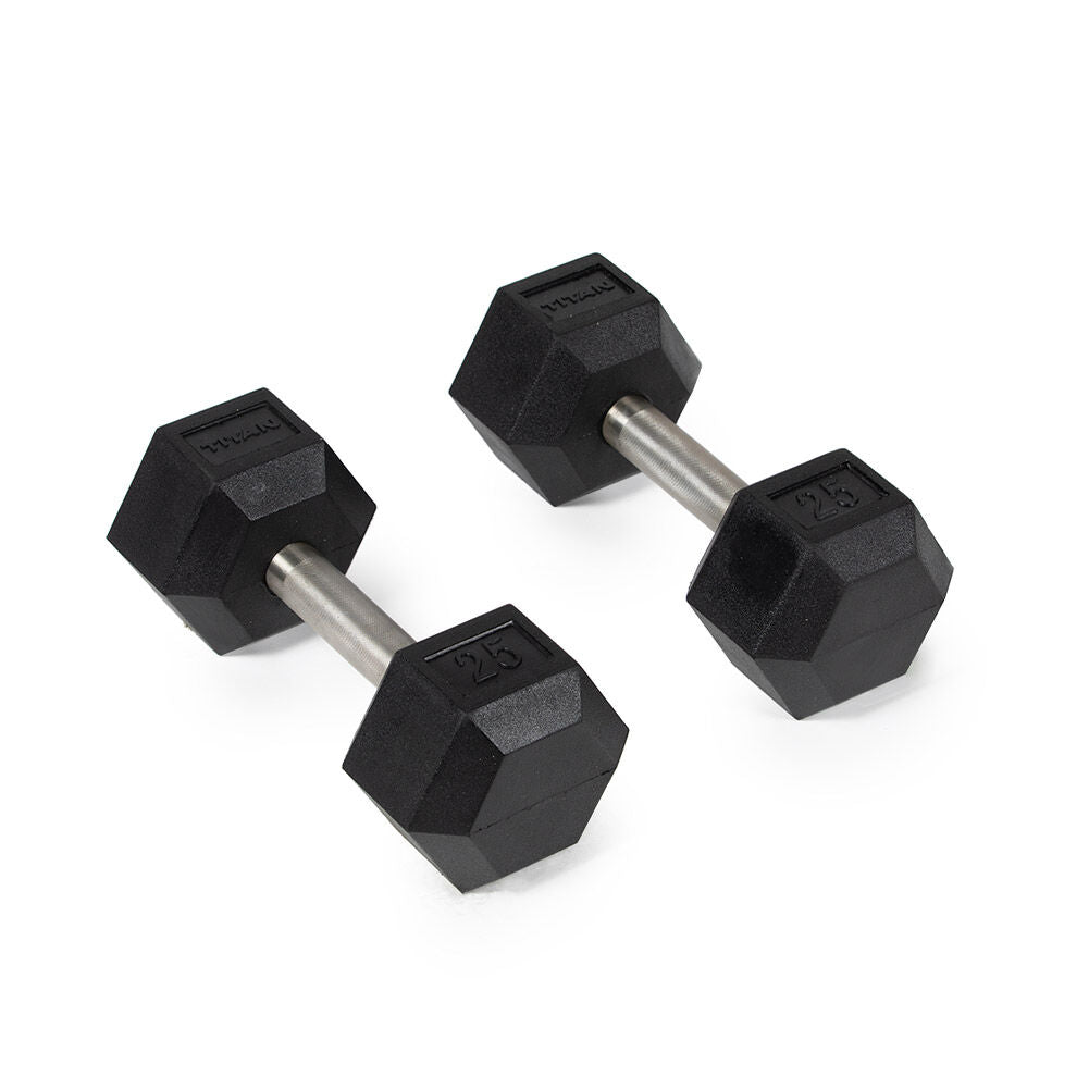 Unleash your inner Titan with the Rubber Coated Hex Dumbbells. These sturdy weights are premium quality equipment ideal for home and garage gyms. Made from stainless steel, these straight, easy-to-grip handles encased with a protective black rubber coating helps to prevent damage to your floors. They are offered in pairs of 5-pound increments from 5 to 120-pounds featuring a 5-inch straight handle with a 25mm to 35mm diameter and knurled texture for a comfortable and firm grip that holds up to use and weather. The durable, black rubber hexagonal heads detail embossed weight increments and the TITAN logo on two sides for easy identification. These branded dumbbells are a great addition to any gym, whether you are just starting or a seasoned lifter.