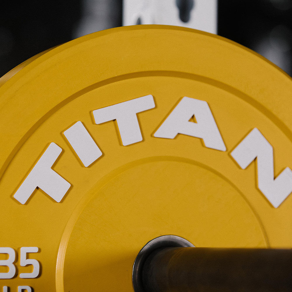 Unleash your inner TITAN with the Economy Rubber Bumper Plates, color-coded to make it easier to organize and find the correct plate at a glance. Crafted from durable, solid rubber with a 50.6mm weighted steel-lined collar that reinforces the plates for training that involves dropping plates from overhead or shoulder height. Each plate features dual raised TITAN logos, LB weight indications, a raised plate lip, and is designed with a low bounce rate for more control over the barbell when it hits the ground. These easy to identify colored bumper plates are extremely durable, perfect for use in home gyms, and ready for you to max out your next PR.