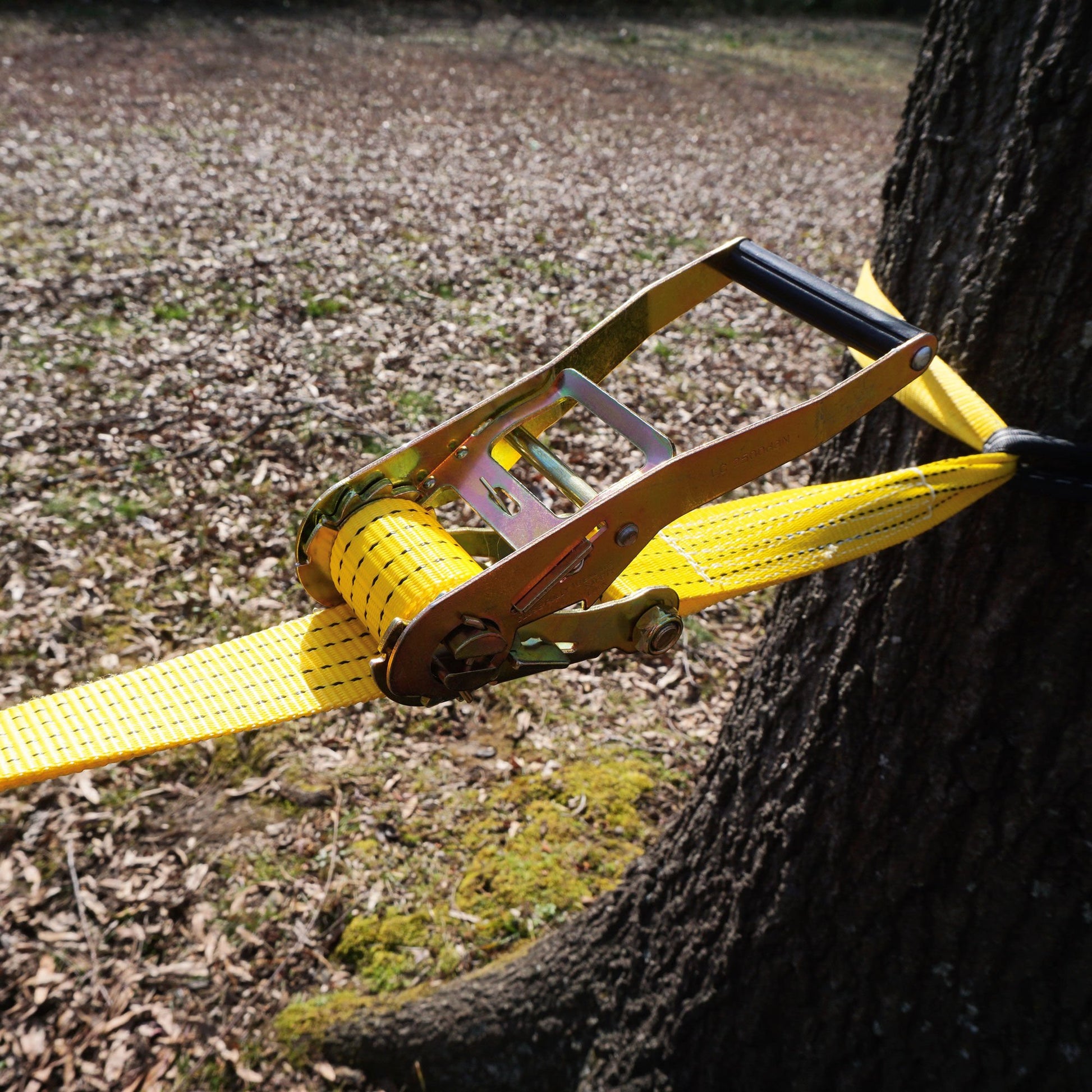 Simply wrap the tree/structure straps around a steady object, attach the slack line strap, and tighten as needed with the provided ratchet binders.