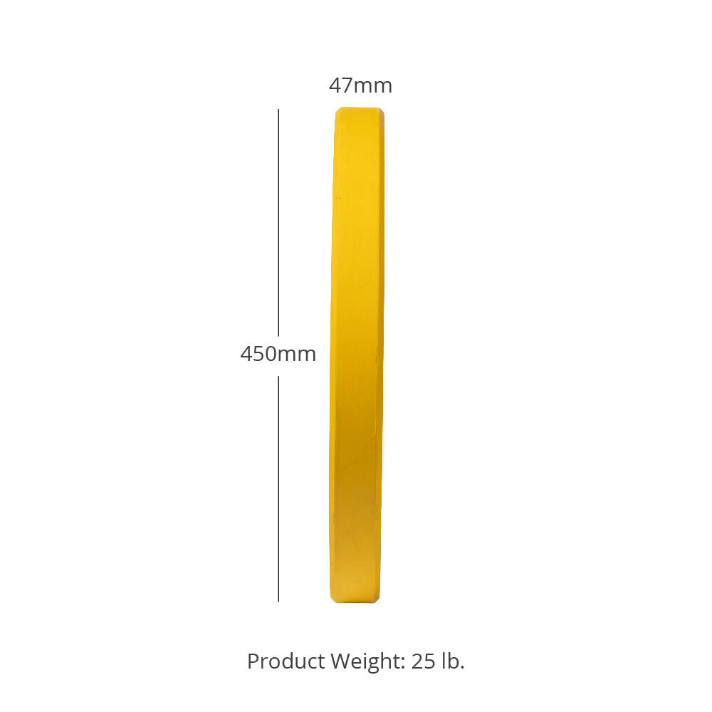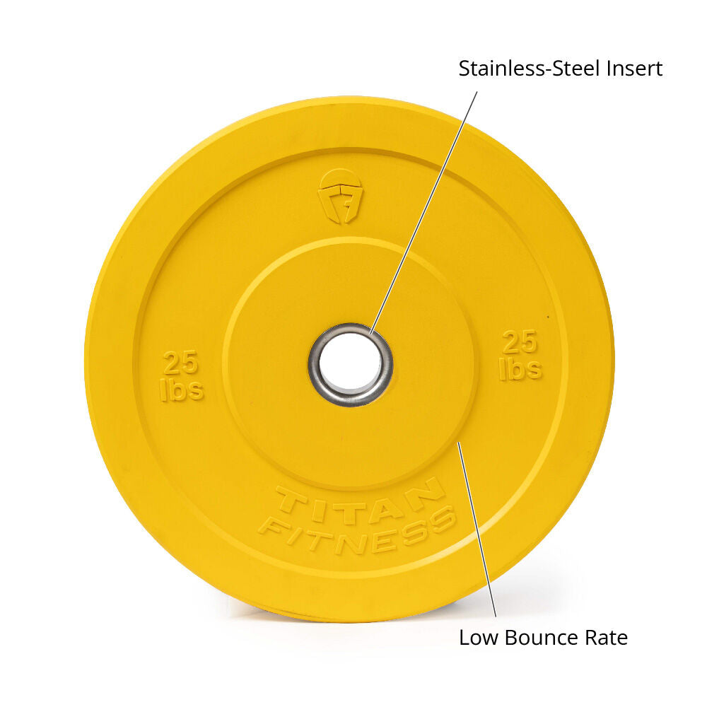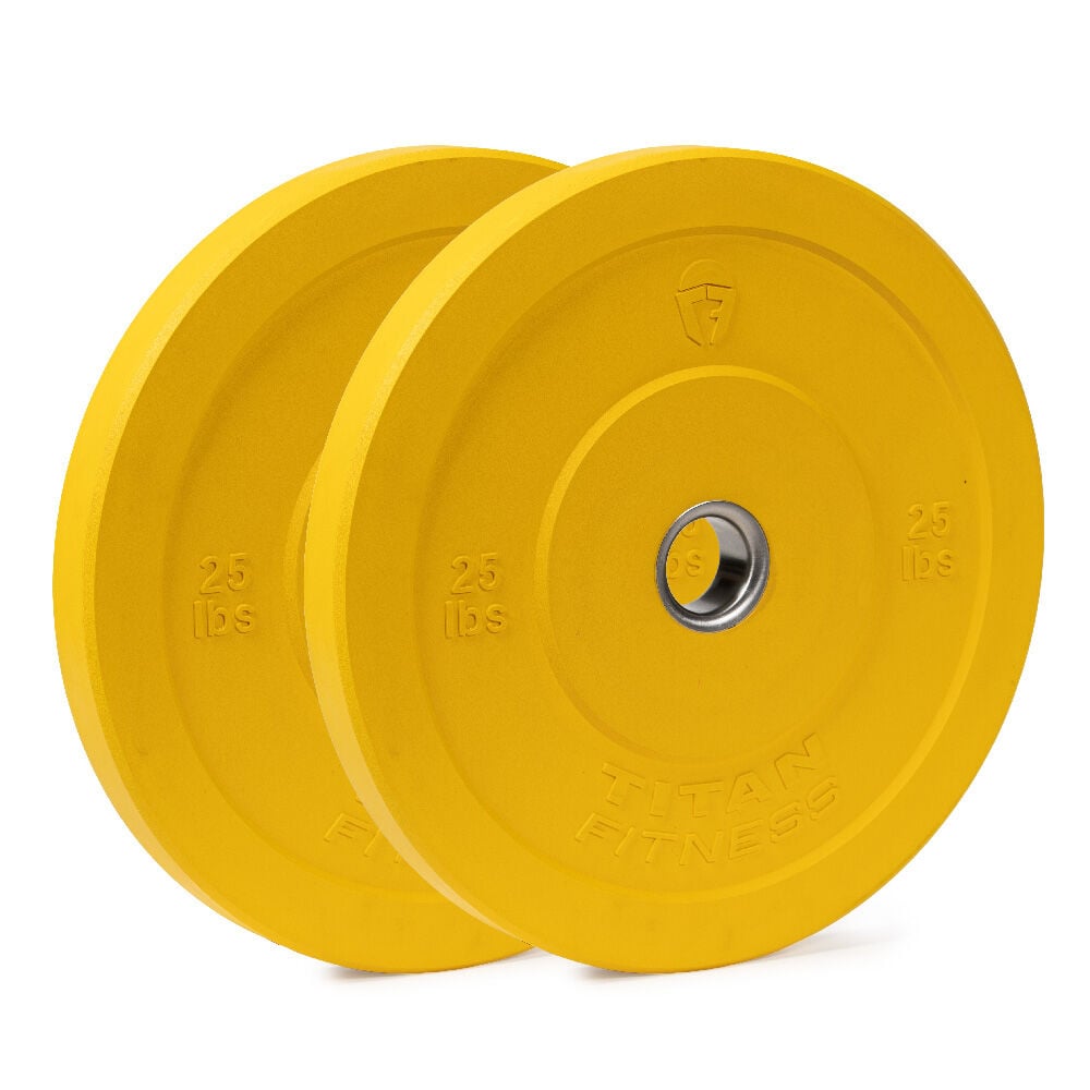 Titan Fitness bumper plates are excellent additions to any home gym. This is a pair of 25 lb yellow rubber bumper plates. The 2” steel-lined center holes snugly fit Olympic size barbells and maintain their shape in between uses. This is an economy bumper plate, perfect for use in a home gym, and is not intended to withstand being dropped or thrown on the floor. Please note that rubber bumper plates may have a sheen present on the finish from manufacturing, which can easily be removed with a mild dish soap. We also offer 60” and 86” Olympic bars, plate and barbell storage trees, and power racks to push them up from.