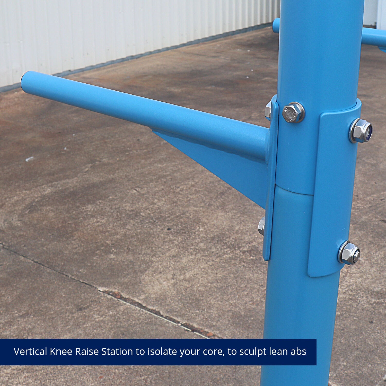 Take your workout outside with the Outdoor Power Tower! Featuring four workout stations to develop the muscles in your chest, abs, shoulders, and biceps. Made from heavy-duty steel, stainless hardware, and a thick powder-coated blue finish to ensure a weather-resistant and lasting design.