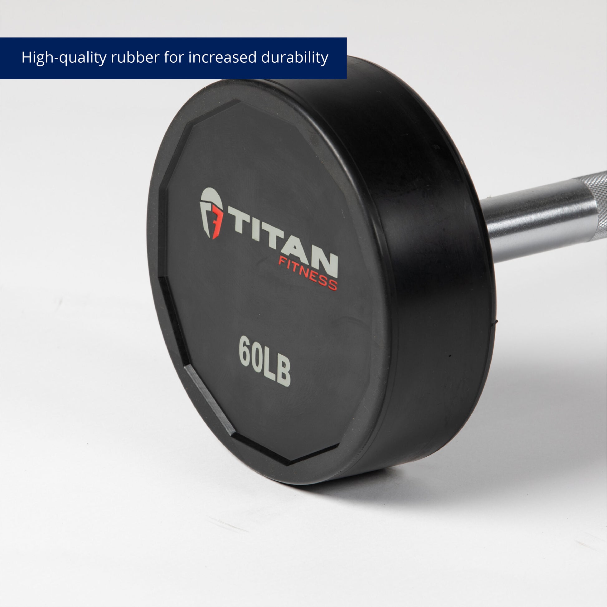 The Rubber Fixed Barbells from Titan Fitness are made from high quality steel fully encased in rubber for a durable design and a clean finish.