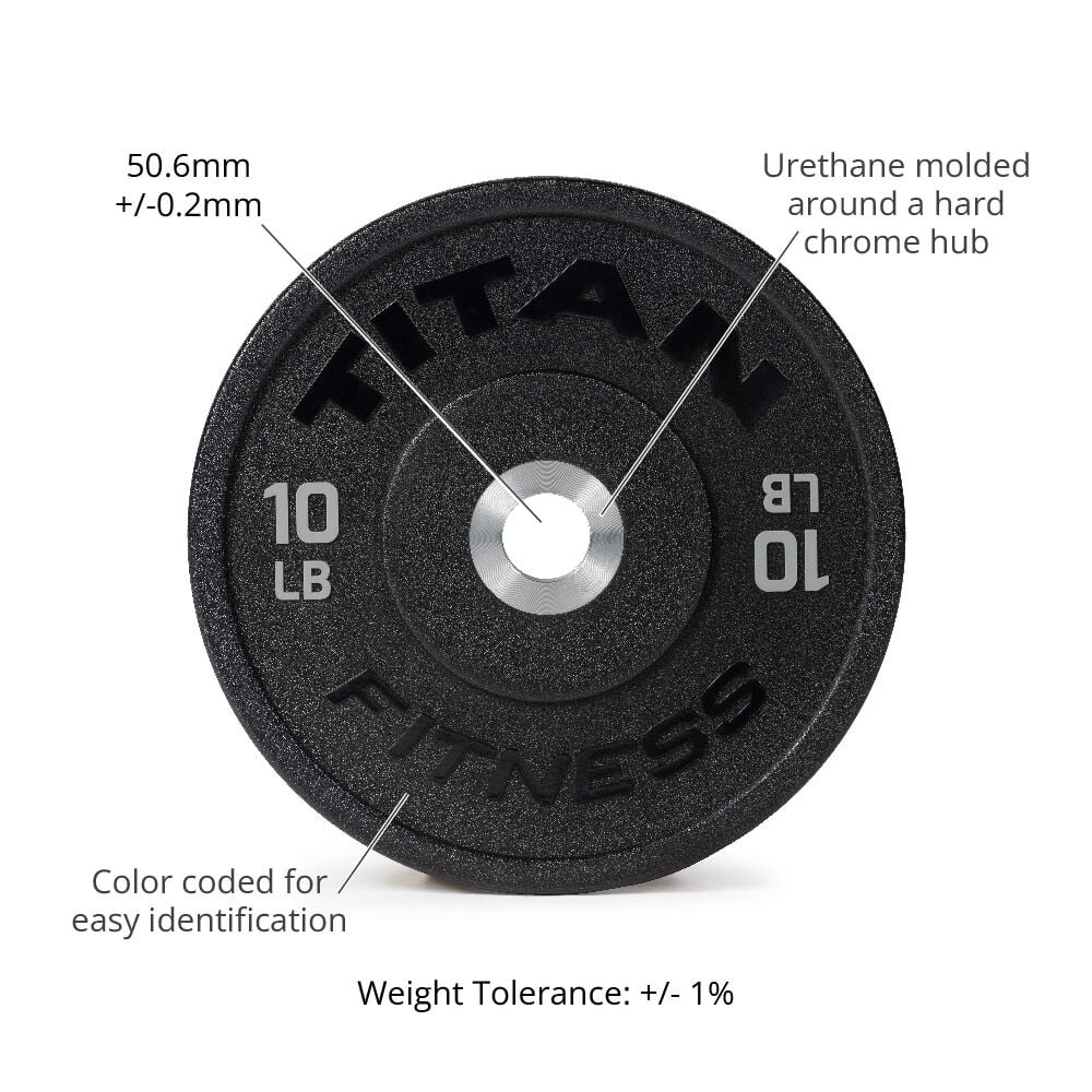 The Titan Fitness Urethane Bumper Plates are top quality plates at the right price. Designed from high quality, vibrantly colored, urethane molded around a hard chrome hub for a durable and long lasting performance.
