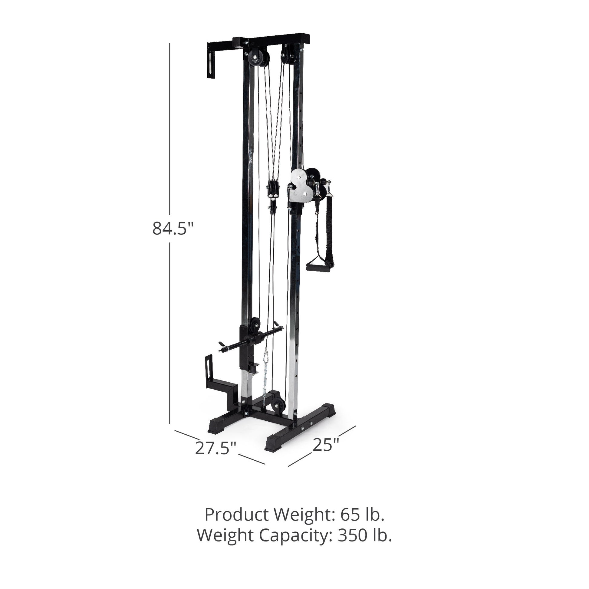 The versatile workout offered by the Tall Wall Mounted Pulley Tower will add new depth to your home gym experience. Bulk up your fitness routine with pulldown and low-row training exercises that build strength for your lower / middle back muscles and forearms. With up to 350 LB weight plate capacity, you can efficiently perform pulldowns, squats, lunges, rows, and more. This pulley tower is plate-loaded, featuring 1-in. weight posts, spring clips to match, and dual stirrup handles for developing triceps and back muscles in pulling and rowing exercises. The cable tower is built for long-lasting use, ensuring its durable steel construction will stay strong through even the most intensive workouts. The black and silver design looks sleek in every setting and will compliment your home or garage gym.