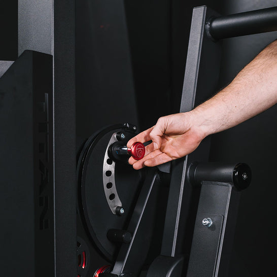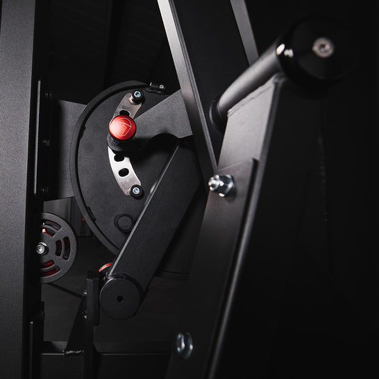 Stainless steel guide rods, laser-cut arm pin plates, and anodized red aluminum hardware keep this unit steady, while front and back weight stack guards keep every rep safe.