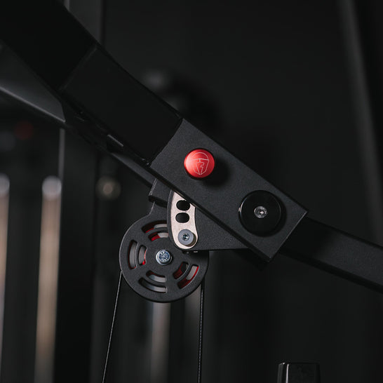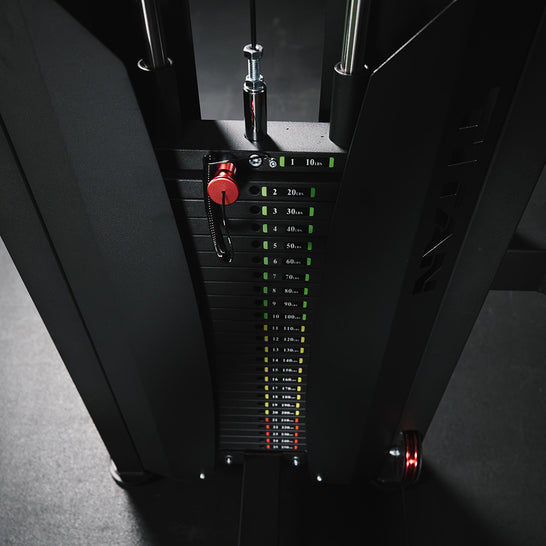 A 250 LB weight stack lets you quickly dial in your resistance in 10 LB increments with a magnetic weight selector pin. Six machined aluminum pulleys and 5mm commercial-grade nylon cables deliver smooth, controlled motion while front and back weight stack guards keep every rep safe and stable.