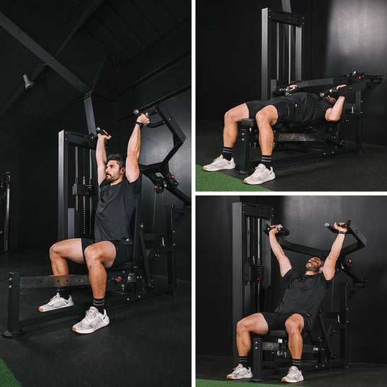 This multi-press machine adjusts to seven bench positions, covering the full pressing spectrum, from flat to incline to fully vertical shoulder presses—without swapping out machines.