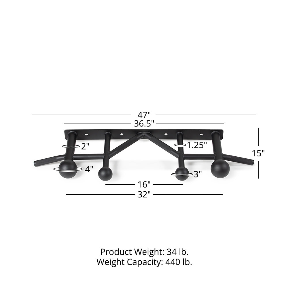 The Sphere Grip Pull-Up Bar offers unlimited grip choices for pull-ups and chin-ups, allowing you to work with various muscle groups. This versatile and compact training station attaches to your T-3, X-3, or TITAN Series Power rack with the addition of a Crossmember Stabilizer, sold separately. Build forearm and grip strength with the versatility of the multiple training options. The outside neutral grips feature fat diameters while the rest are sized standard. The 3-inch spheres are spaced 16-inches on the center, while the 4-inch spheres are spaced 32-inches on the center. If you are looking for a new way to improve your grip strength and work different muscles, the Sphere Grip Pull-Up Bar is your attachment.