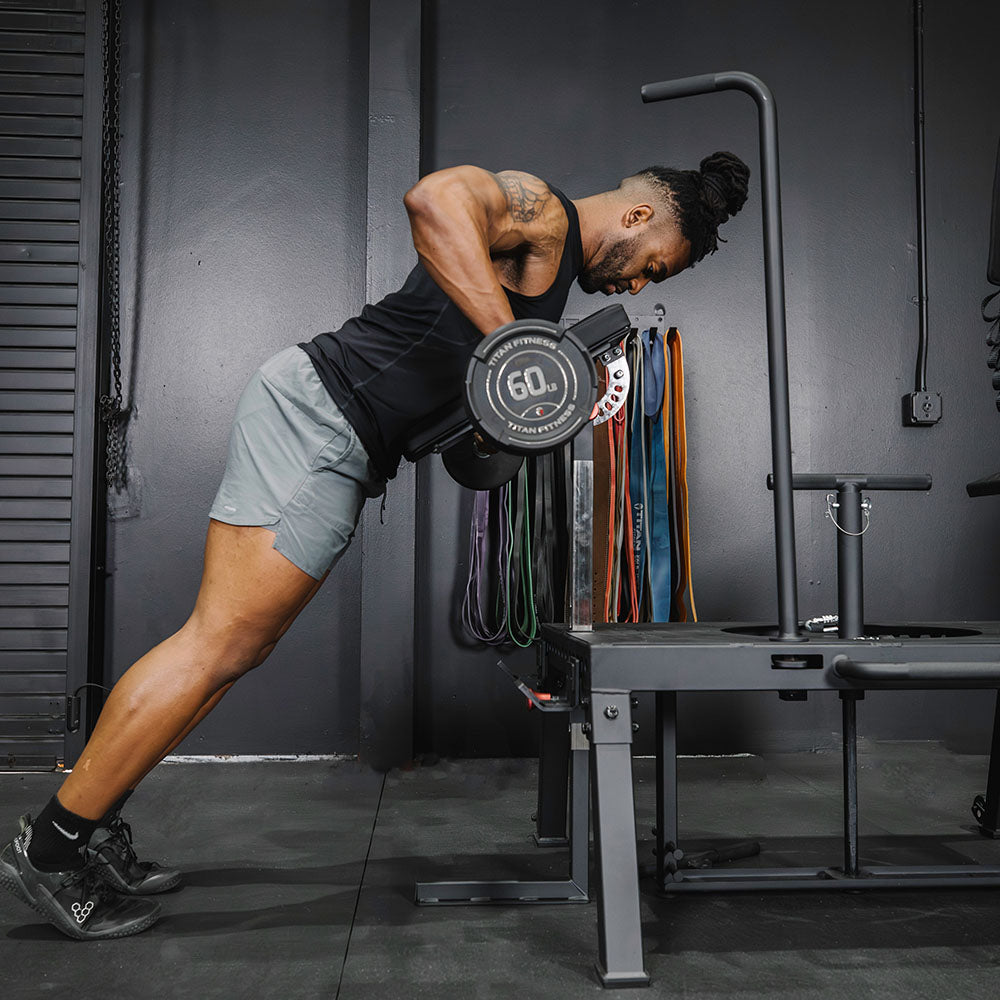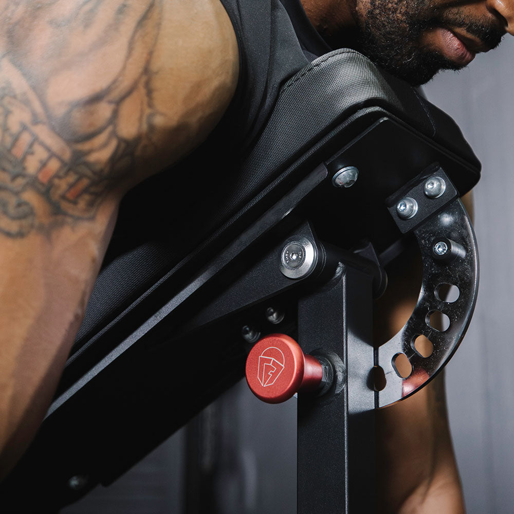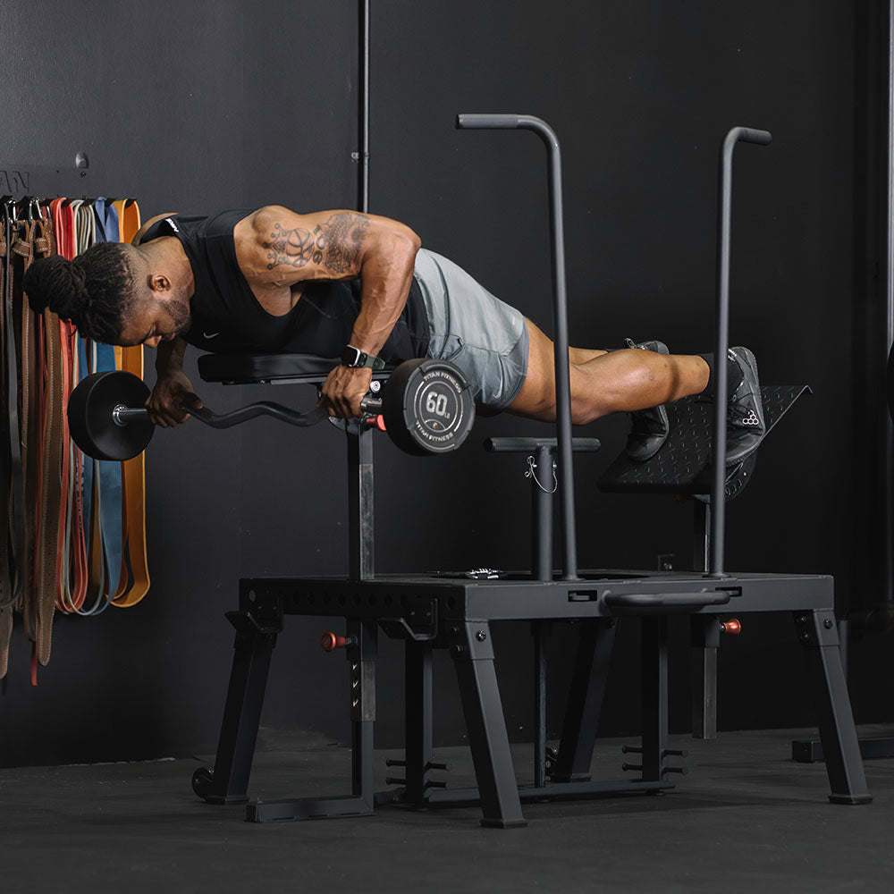 Perform weighted hip thrusts with the cushioned support pad and stable footplate, using the plate-loading pin to align the weight directly under your body for more effective glute activation. Or use the pad with the J-cups for controlled, supported rows, reducing lower back strain while maximizing upper-body engagement. For deadlifts, use the T-bar as a handle grip for next-level arm strength.