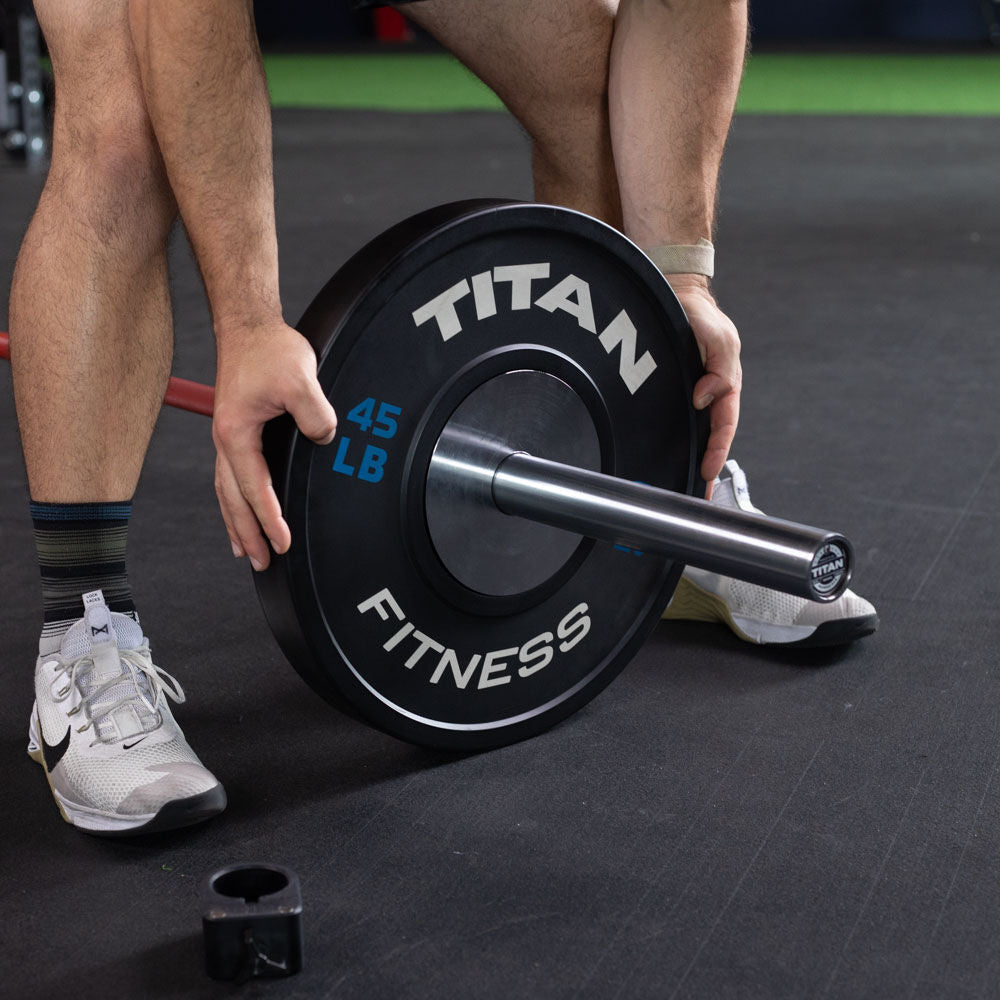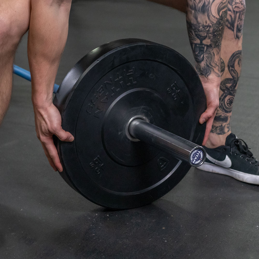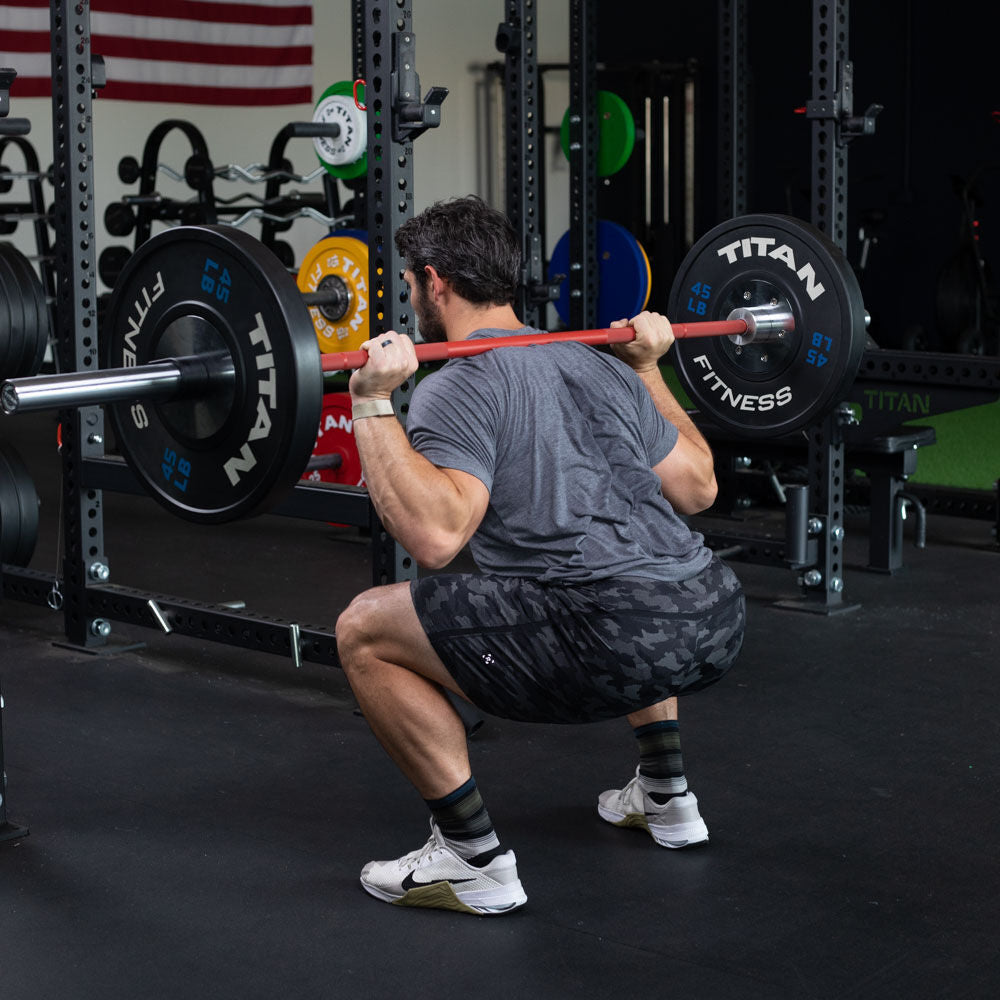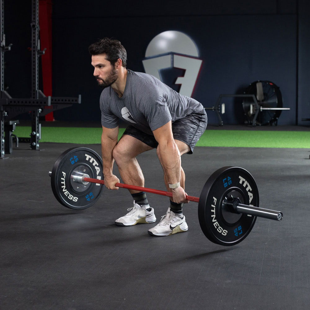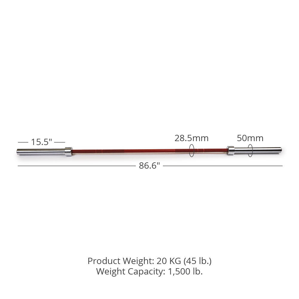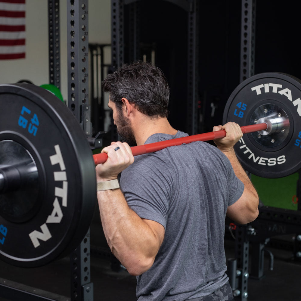 Unleash your inner Titan with the TITAN Series Cerakote Olympic Barbell, part of our exclusive selection of barbells made in the USA with hand-selected American steel. This top-of-the-line multipurpose barbell features a red Cerakote shaft with hard chrome coated sleeves. All versions of the TITAN Series Barbells are constructed from virgin, non-recycled American Steel from the USA with a 190,000 PSI tensile strength shaft, dual knurl marks, medium diamond textured knurling, and bronze bushings. Suitable for Olympic weightlifting and Powerlifting, this balanced hybrid bar provides the right amount of whip or flex for fluid movement through your lift. Smash your daily workouts and hit your PR with this top-rated bar.
