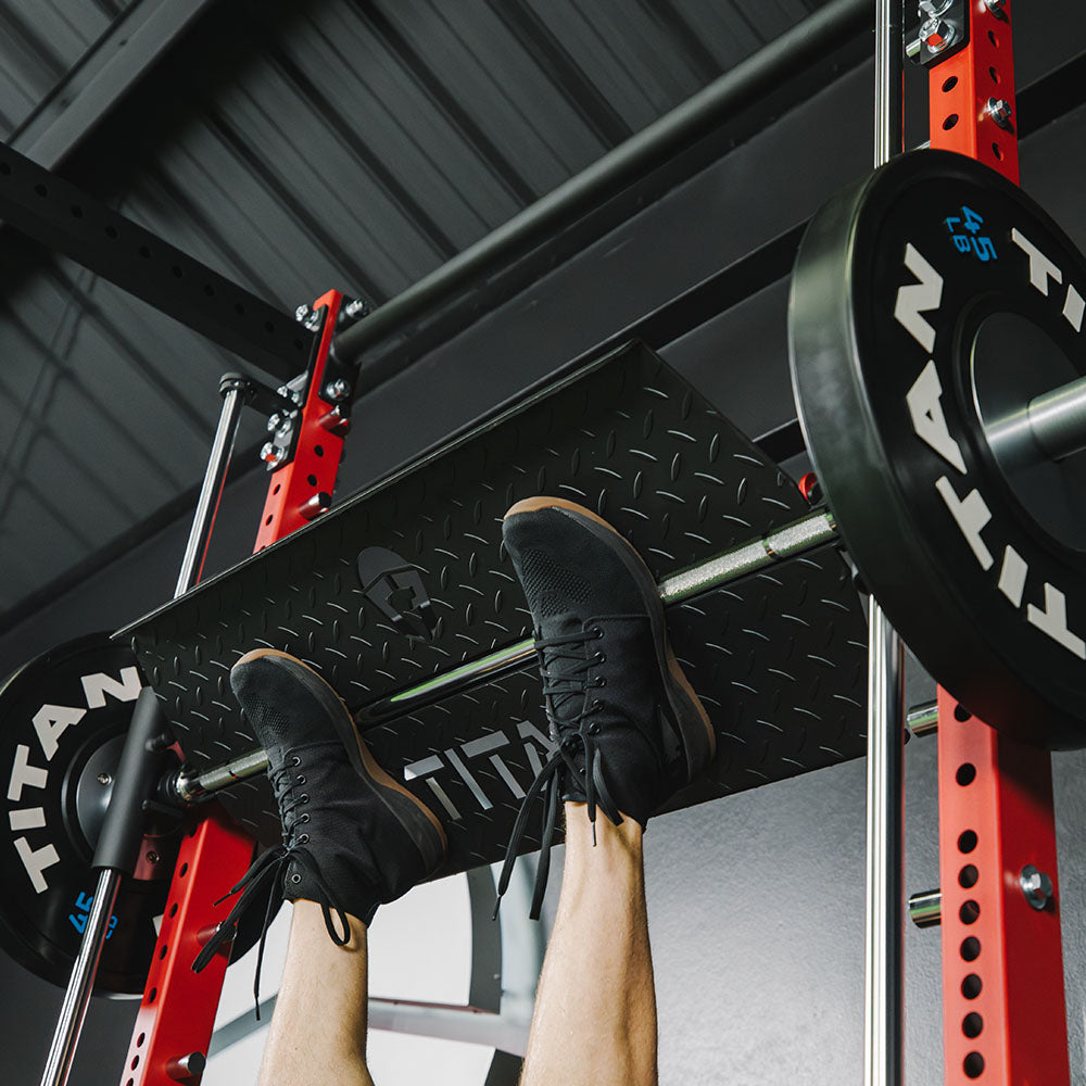 Built to integrate with T-3, X-3, and TITAN Series Smith Machine power rack attachments, this Vertical Leg Press add-on allows you to safely perform vertical leg presses without a spotter. Train to failure then simply pivot your feet forward to lock out and stop at any level. This attachment features red anodized pins that can be locked open to easily mount on your barbell, then unlocked to secure the foot plate.