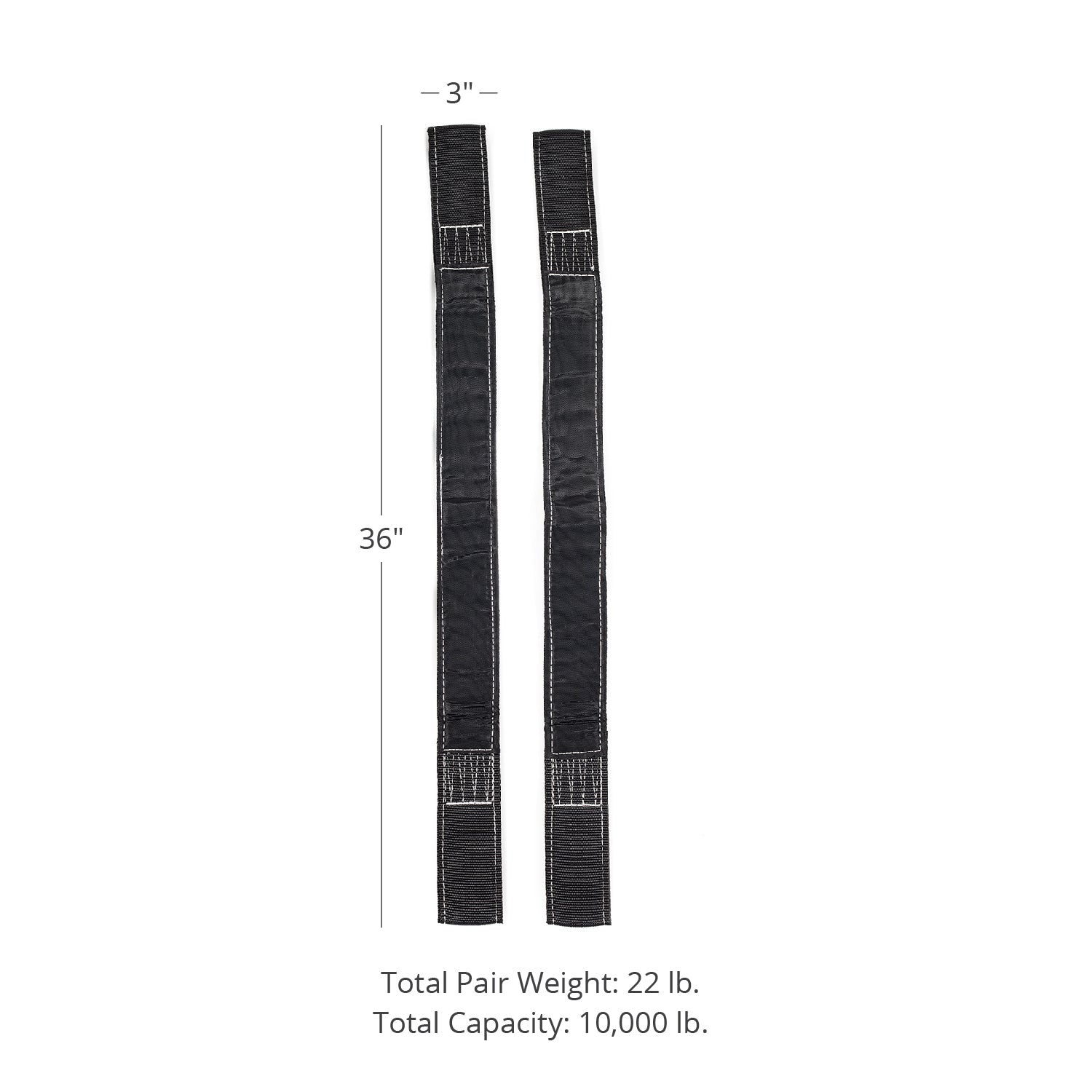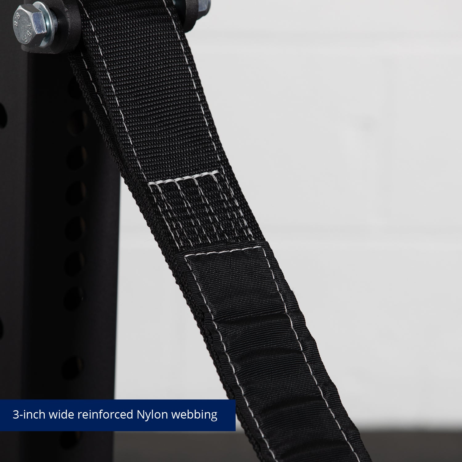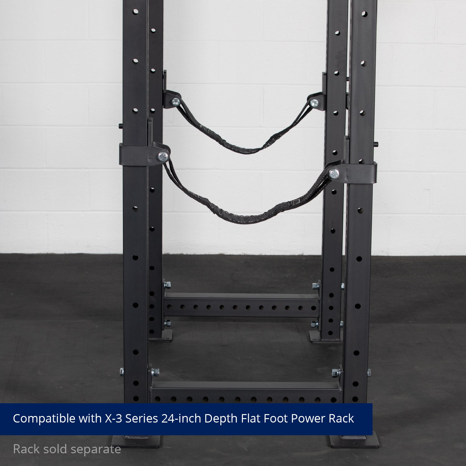 Built for heavy-duty training, the 24" and 36" depth strap safeties are designed for X-3 Series bolt-down power racks, while the 30" straps fit X-3 Series flat-foot racks. Each set is sold as a matched left and right pair.