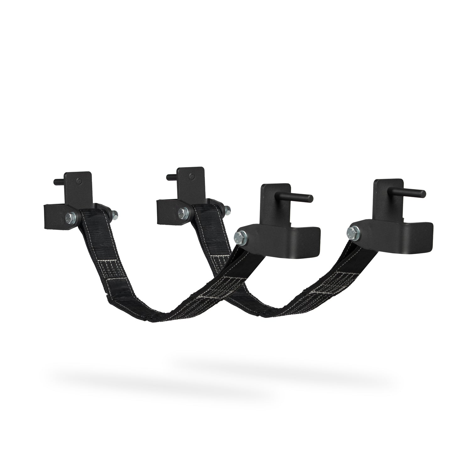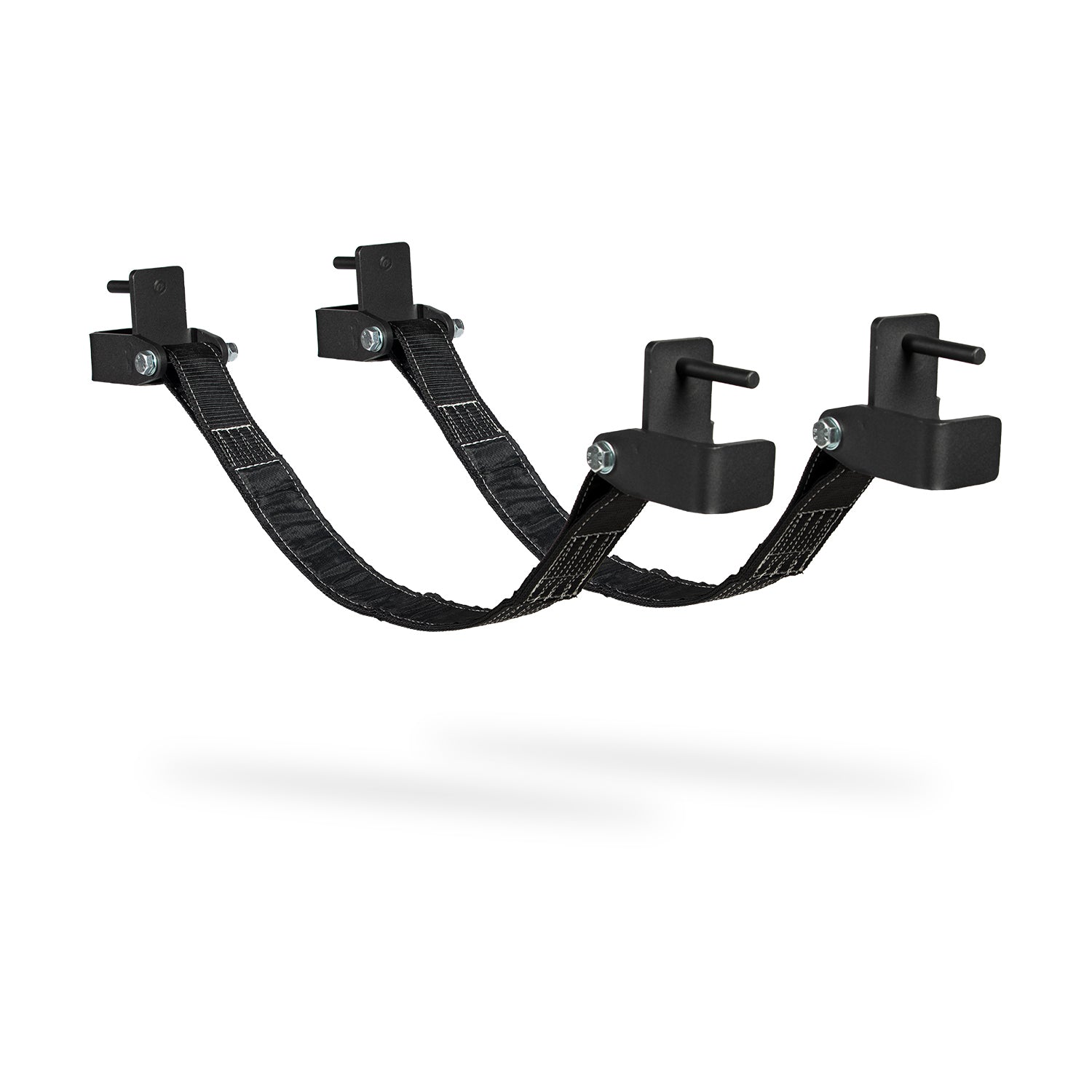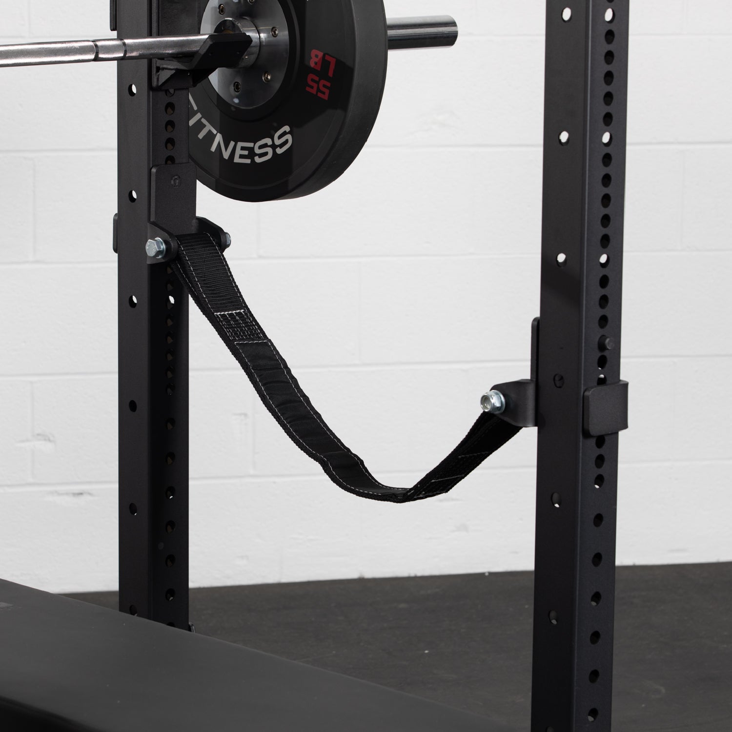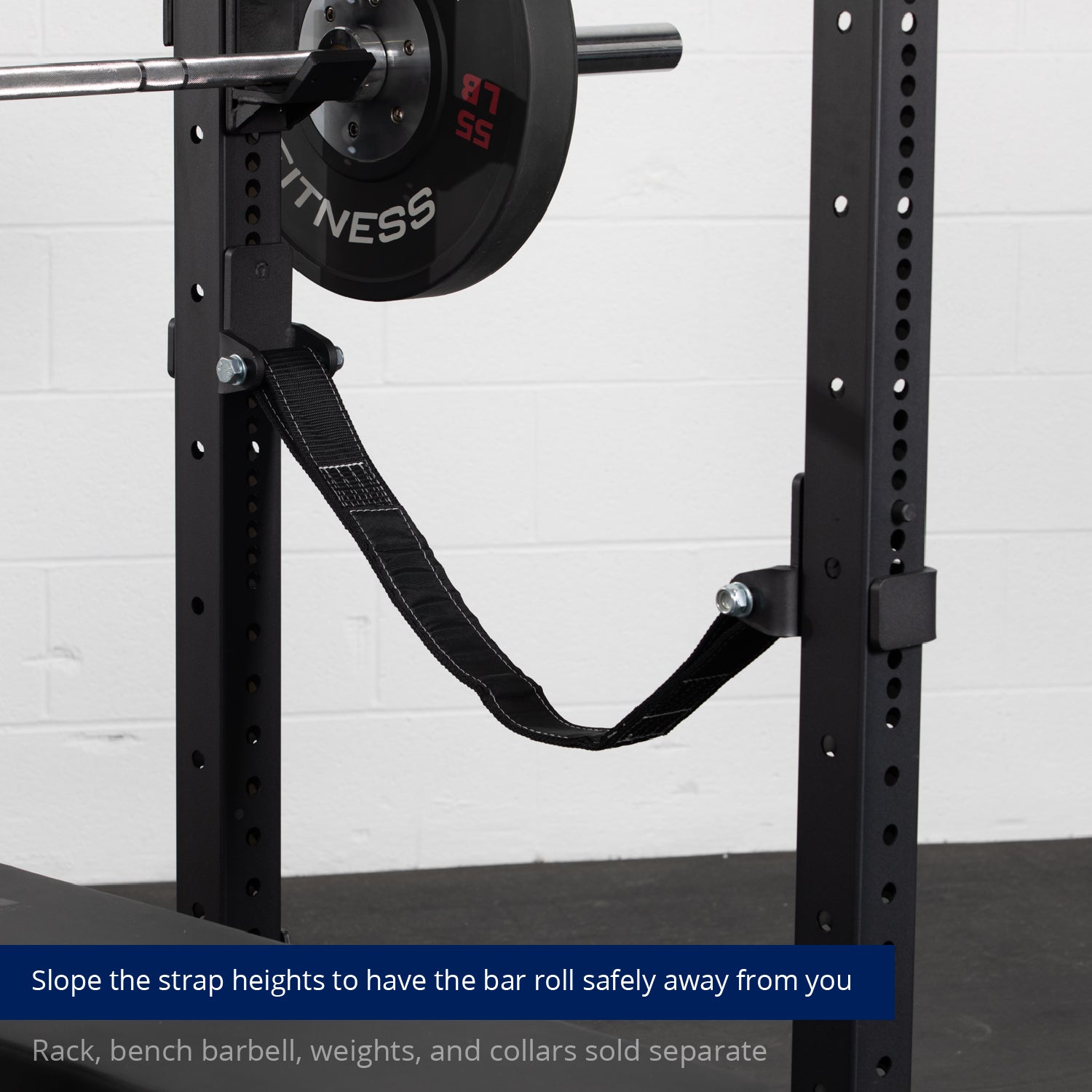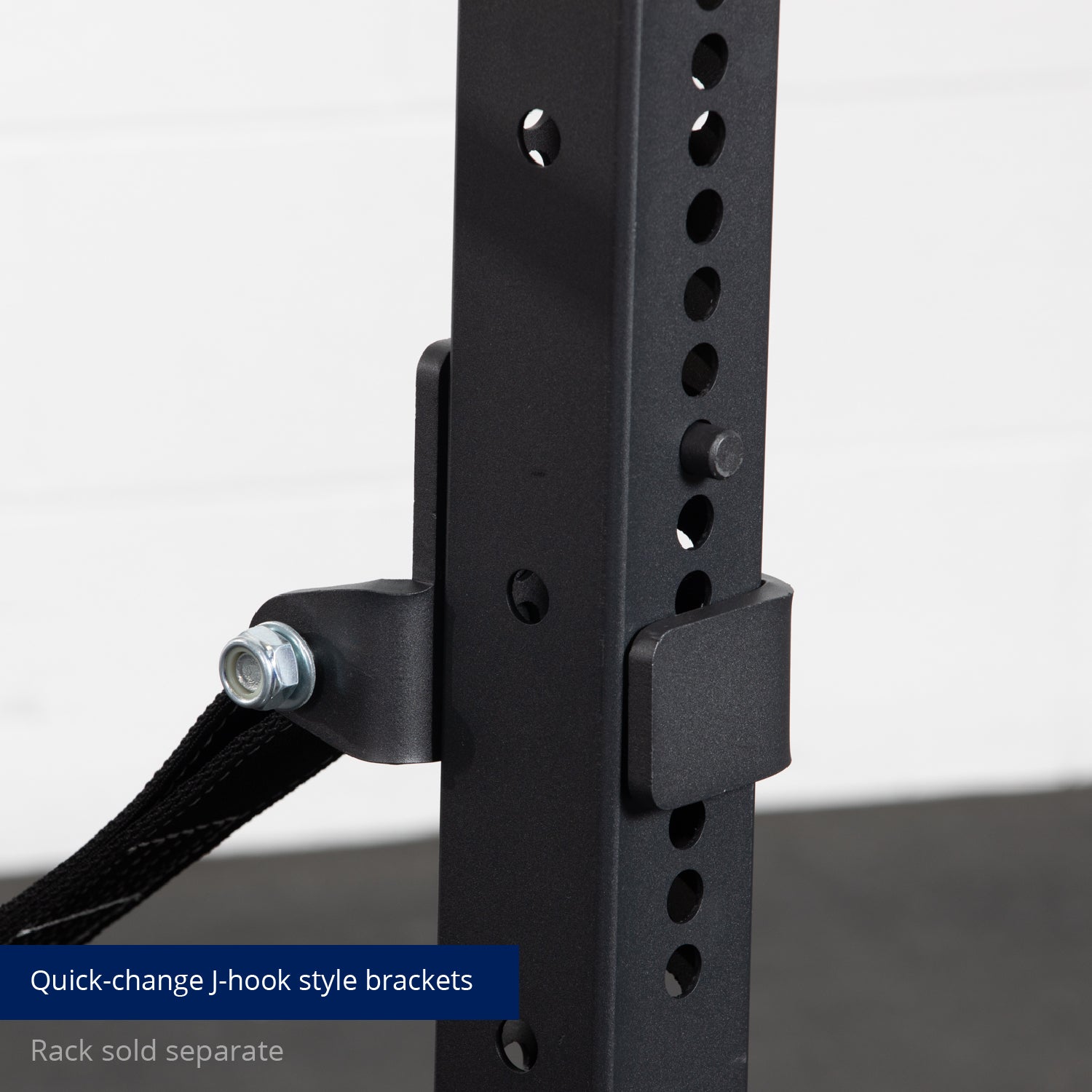 Upgrade your rack with strap safeties that deliver quiet, bounce-free catches during failed lifts while protecting your bar's knurling from damage. Each strap is built from 3" wide reinforced nylon webbing with a combined dynamic drop capacity of 10,000 LB. The quick-change J-hook style brackets let you install or adjust the system in seconds, so you can set different heights and allow the bar to safely roll away from you.